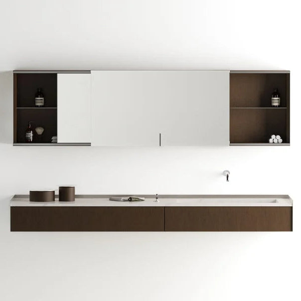 Internamente, lo specchio è organizzato con partizioni in acciaio inox spazzolato, che ne confermano la robustezza e la qualità dei materiali impiegati. L’impostazione rigorosa delle forme e dei materiali contribuisce a rendere questo specchio un elemento discreto ma di forte presenza architettonica.