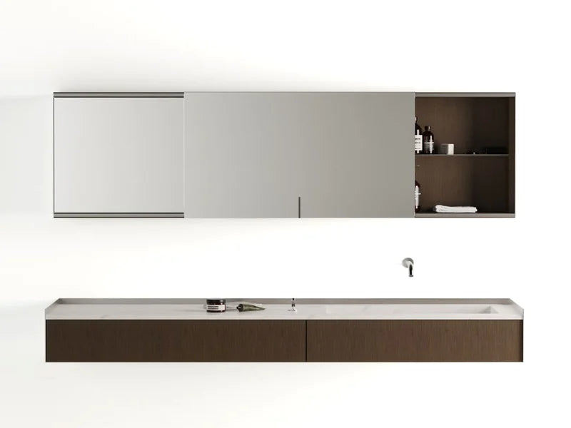 028 è lo specchio contenitore che nasce come evoluzione naturale del modello 027, con cui condivide l’estetica minimalista, la pulizia delle forme e la cura estrema nei dettagli. Firmato da Benedini Associati per Agape, 028 introduce una nuova funzionalità che ne accresce il valore: le ante specchiate scorrevoli, che permettono di chiudere completamente il vano contenitore, mantenendo l’ambiente bagno ordinato ed elegante.