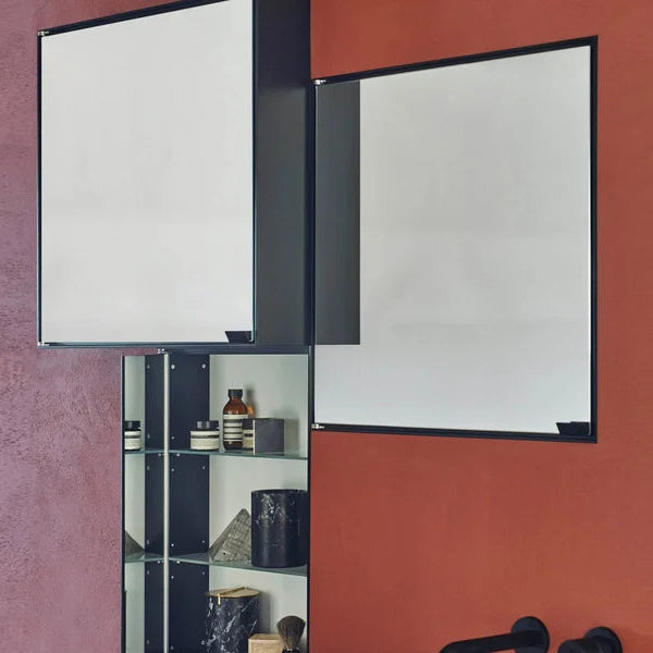 Lo specchio quadrato 4x4 nero con contenitore di Benedini Associati per Agape è la soluzione ideale per chi cerca un design funzionale e raffinato per il bagno. Questo specchio, con apertura a destra e maniglietta posizionata in basso, è realizzato in alluminio di alta qualità e dotato di un ripiano interno, perfetto per riporre piccoli oggetti da bagno.