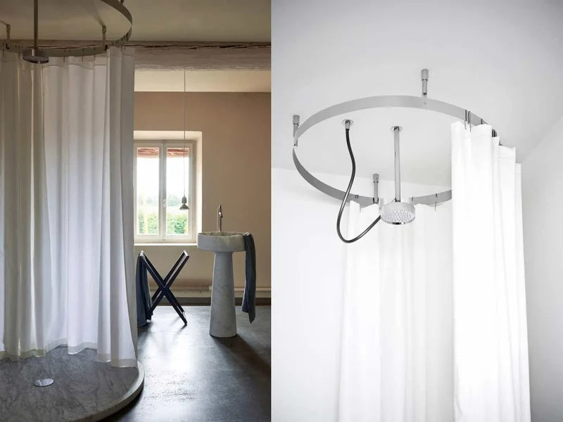 Il Cooper Sistema di Supporto per Tende Doccia, progettato e prodotto dal brand Agape, è una soluzione innovativa che trasforma il bagno in uno spazio intimo e leggero. La sua semplicità è ciò che lo rende incredibilmente versatile, offrendo un'ampia flessibilità nelle configurazioni per tende doccia.