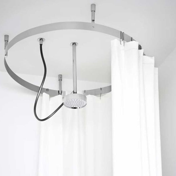 Il sistema si compone di un nastro in acciaio inox che viene appeso al soffitto tramite supporti cilindrici, creando una tenda scorrevole che può essere utilizzata con diversi tipi di tende, sia ad anello che aperte, grandi o piccole, a seconda delle tue esigenze e dello spazio disponibile.