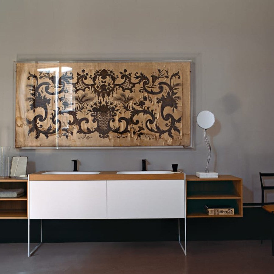 Modular cabinets complete the setup and can be configured as wall-mounted or wheeled, with open compartments or drawers, available in various heights, depths, and widths. These elements allow you to shape your bathroom space precisely as needed.