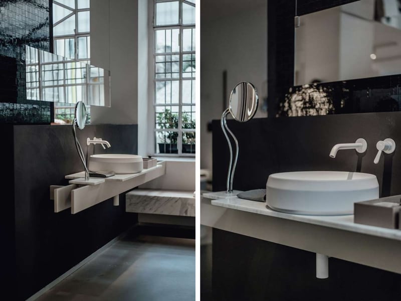 Oltre alla versione rettangolare, la collezione presenta varianti ovali e tonde, come questa versione tonda da appoggio, che può essere installata su un piano d’appoggio o su una colonna separata. La forma tonda di Lariana è ideale per chi cerca un design audace o più tradizionale, ma sempre elegante e funzionale.
