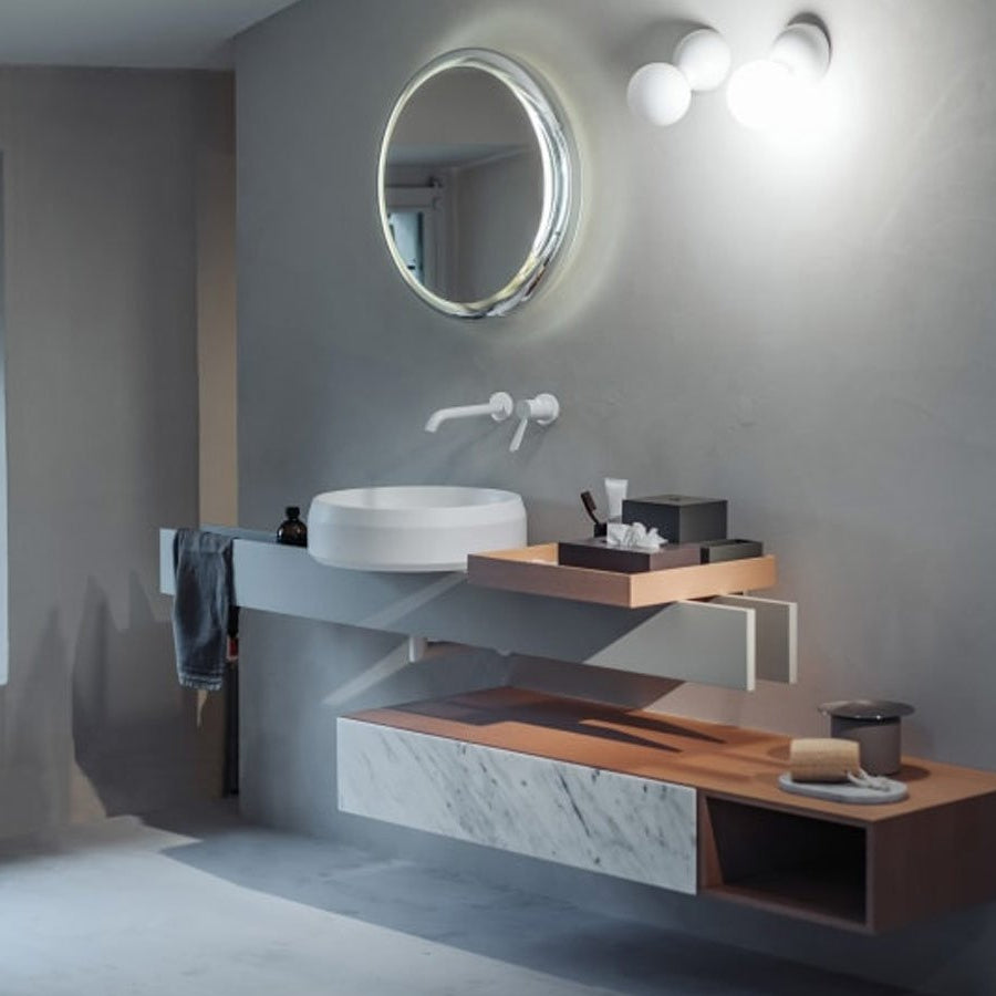 Le finiture disponibili – alluminio anodizzato nero, bianco opaco e grigio chiaro – offrono versatilità stilistica, mentre la modularità degli accessori permette di adattare la composizione alle esigenze d’uso. In abbinamento con i lavabi da appoggio Lariana, disponibili in Cristalplant®, Solid Surface o marmo, Rigo diventa un sistema completo e distintivo.