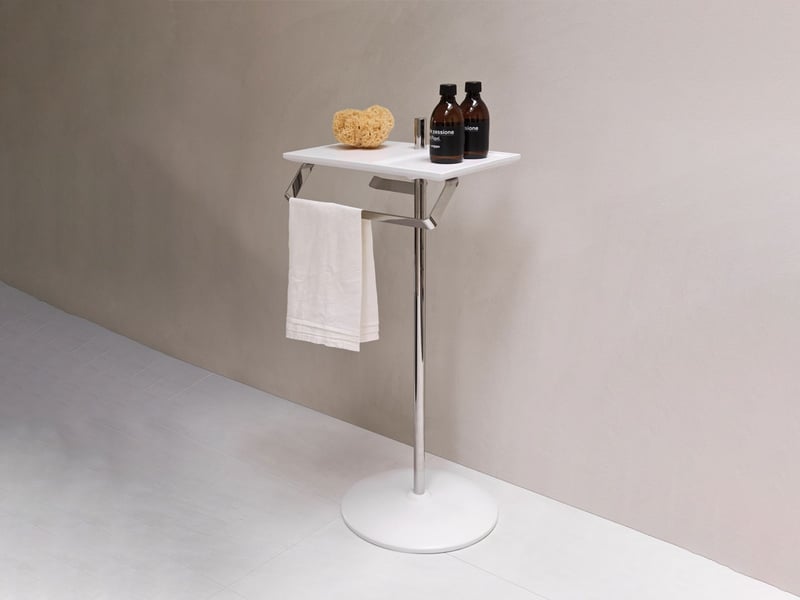 La struttura regolabile in altezza ti consente di adattarlo facilmente alle esigenze specifiche del tuo bagno, rendendolo perfetto per essere posizionato accanto a mobili, lavabo, vasca o sanitari. Realizzato con materiali di alta qualità, come il solid surface bianco per la base e il ripiano, Ted non solo aggiunge un tocco di eleganza senza tempo, ma è anche estremamente facile da pulire e mantenere, mantenendo il tuo bagno sempre impeccabile. La combinazione di funzionalità e design raffinato fa di Ted un accessorio indispensabile per ogni ambiente bagno moderno.