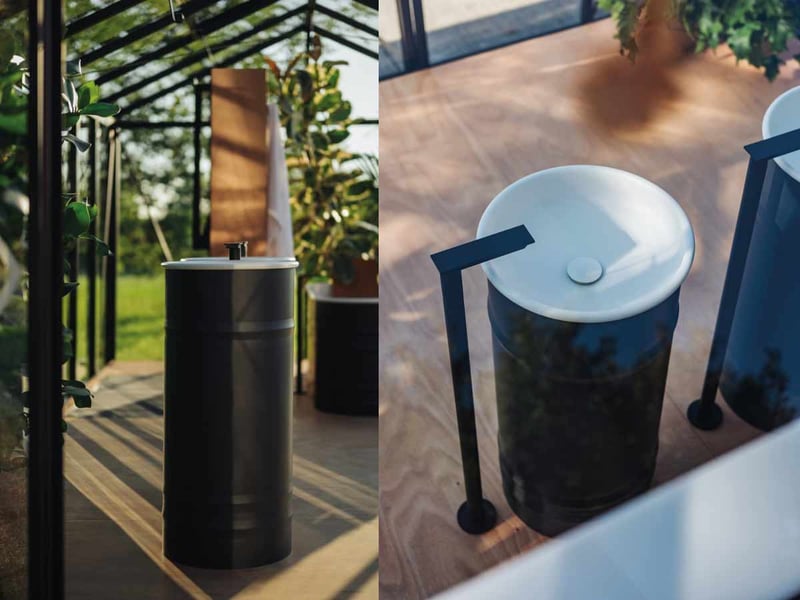 Il lavabo può essere arricchito con una mensola in legno di iroko sul bordo, che offre una superficie di appoggio aggiuntiva, combinando funzionalità ed estetica. La sua versatilità permette di collocarlo sia a centro stanza che a parete, creando un punto focale sofisticato nel bagno o anche negli spazi esterni.