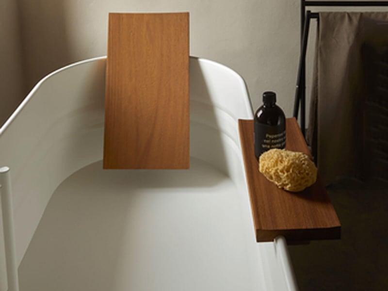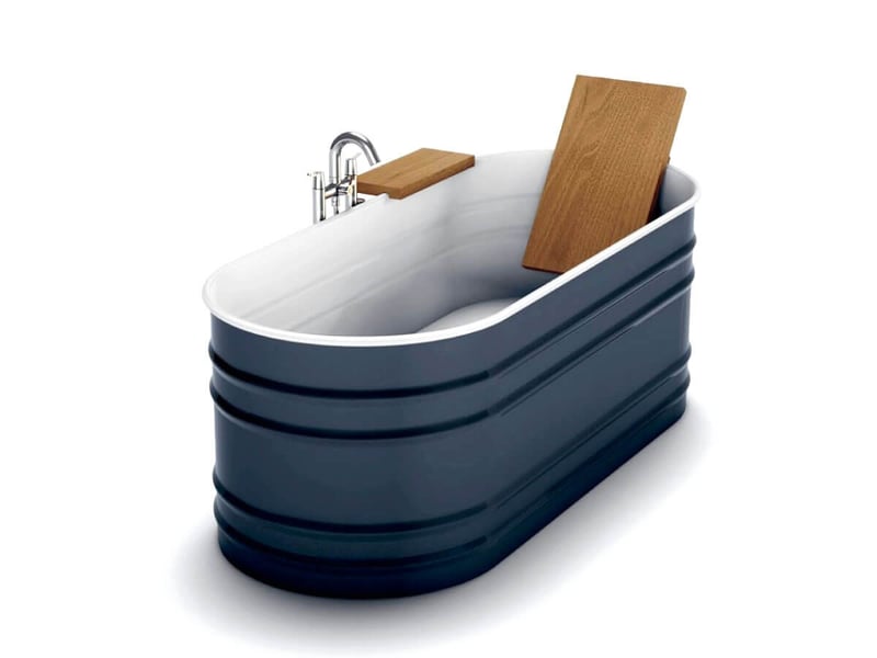 Realizzata in acciaio verniciato con finitura interna bianca (RAL 9003) e esterno grigio scuro (RAL 7021), la vasca è completata da una mensola in iroko e un poggiiaschiena in iroko, materiali naturali che aggiungono un tocco di calore e raffinatezza al design.