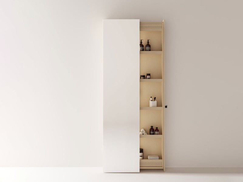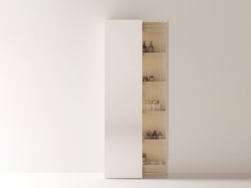 Voilà è lo specchio contenitore verticale progettato da Alessandro Andreucci per Agape, nato dall’incontro tra estetica raffinata e funzionalità intelligente. Un elemento d’arredo innovativo che integra perfettamente uno specchio a tutta altezza con una struttura contenitiva a scomparsa, ideale per mantenere l’ambiente bagno ordinato, elegante e sempre funzionale.