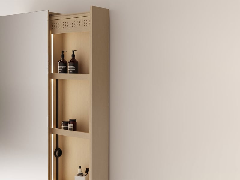 Voilà può essere personalizzato con illuminazione LED integrata e barra elettrificabile compatibile con adattatori per prese italiane, tedesche, inglesi e francesi. Una soluzione pratica e versatile per chi desidera un bagno curato nei minimi dettagli, senza rinunciare alla tecnologia e alla bellezza del design.
