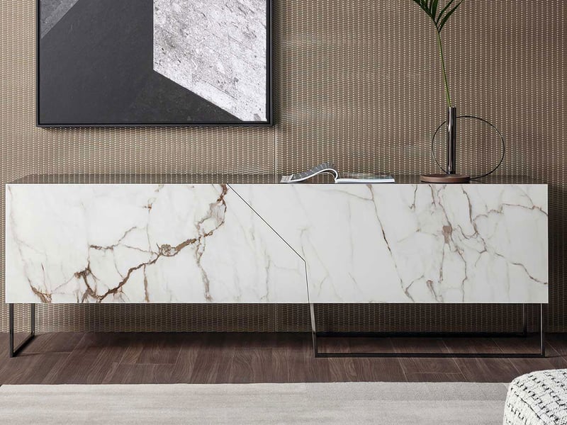 In questa versione bassa, Doppler K è perfetta per ambienti living o notte, grazie al suo design compatto ed espressivo. La base in metallo verniciato Antracite, la struttura in legno nero laccato opaco e le ante in ceramica Calacatta Macchia Vecchia finitura seta creano un mix materico di grande eleganza. Ogni dettaglio è studiato per unire design contemporaneo, funzionalità e impatto visivo.