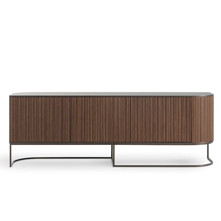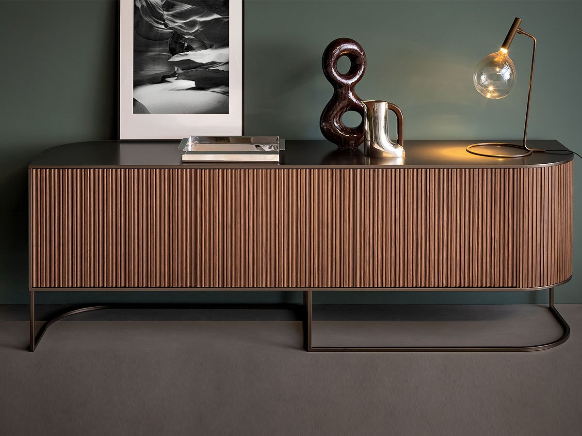 La Madia Dune di Bonaldo, disegnata da Giuseppe Viganò, è un arredo che coniuga architettura asimmetrica e suggestioni organiche, trasformando una semplice contenitore in un elemento di grande impatto visivo. La sua struttura curva e sofisticata, ispirata a forme naturali, è esaltata da una base in tondino metallico continuo, che disegna un profilo grafico elegante e moderno. Le ante frontali in listelli di legno, disponibili in noce Canaletto o rovere carbone, donano ritmo e tridimensionalità alla composizione. Dune è disponibile in due versioni cromatiche, entrambe raffinate e versatili, con ripiani interni in cristallo per un tocco di trasparenza e leggerezza.