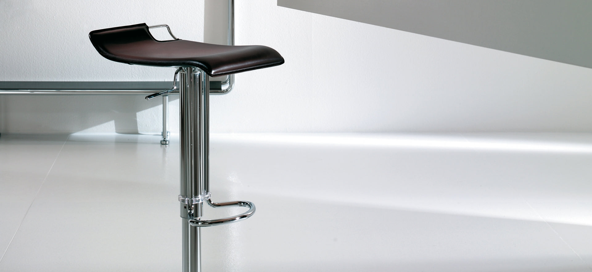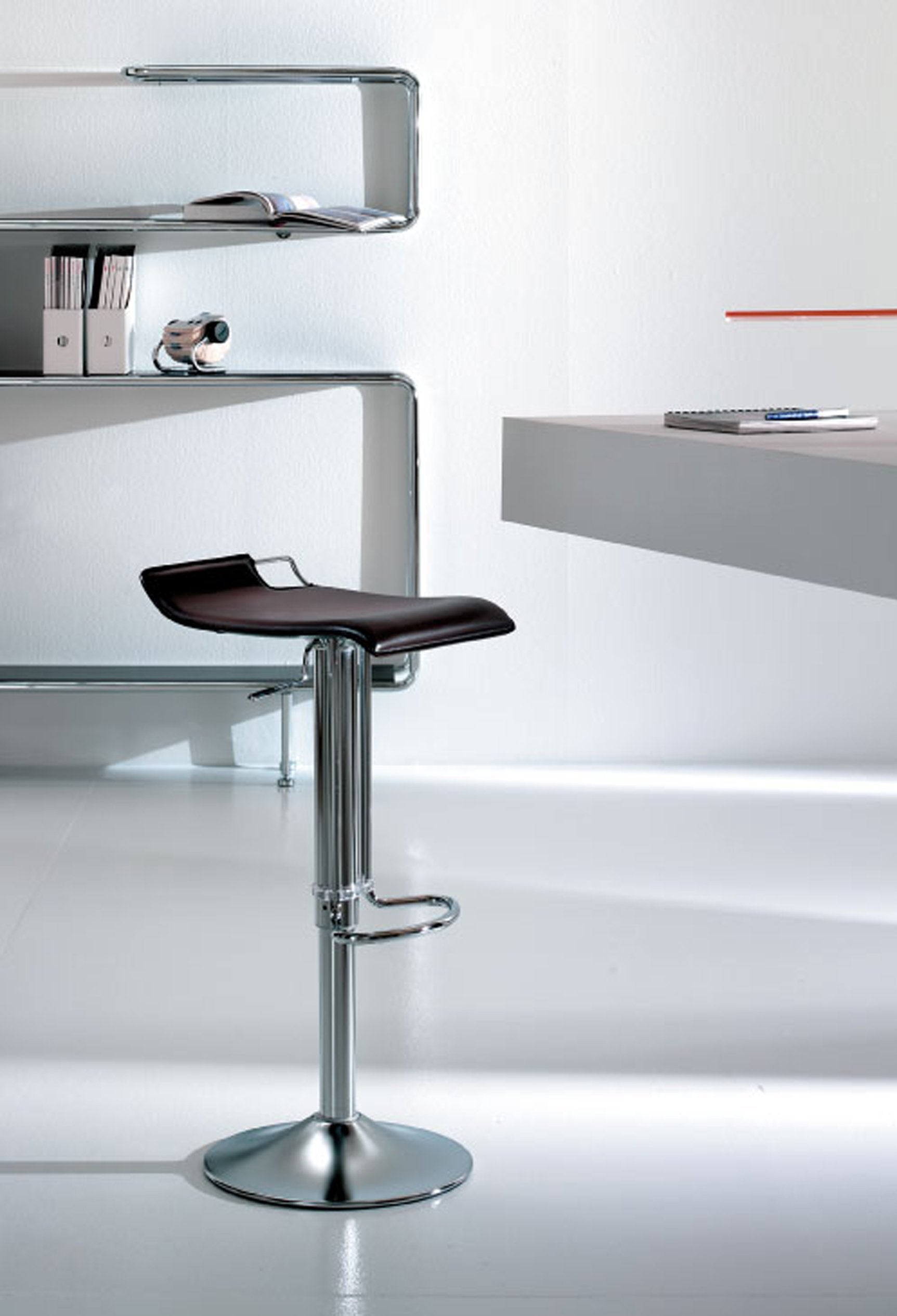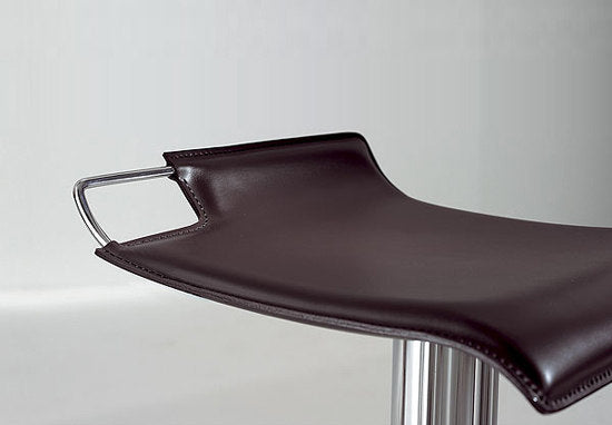 Lo Sgabello Hoppy è l’emblema della semplicità progettuale elevata a segno distintivo. La sua linea essenziale, priva di eccessi ma ricca di carattere, lo rende un complemento d’arredo versatile ed elegante. Dotato di struttura in acciaio cromato e base in acciaio satinato, Hoppy è completamente girevole e regolabile in altezza tramite pistone a gas, per un comfort personalizzabile. La seduta in cuoio color testa di moro, rifinita con cuciture a vista e bordo nero, dona un tocco sofisticato e materico, perfetto per ambienti moderni, professionali o residenziali di gusto.