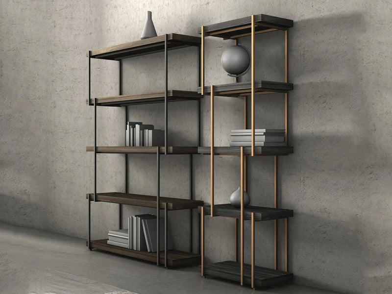 Rain di Bonaldo, firmata da Gino Carollo, è una libreria dal design sofisticato che gioca con le percezioni visive grazie all’alternanza di elementi sottili in metallo e ripiani in legno massiccio. L’elegante contrasto tra la struttura in metallo verniciato rame opaco e le mensole in Noce Canaletto crea un effetto grafico ricercato, capace di donare ritmo e personalità all’ambiente. Con il suo profilo slanciato e la composizione simmetrica, Rain è ideale sia per spazi domestici che per interni professionali, offrendo un’alternativa scultorea e funzionale all’arredo tradizionale.
