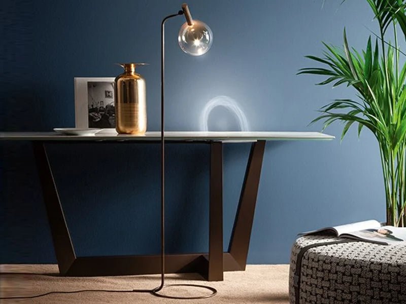 La lampada da terra Sofì di Bonaldo, firmata Studio Team Design, è un raffinato tributo alla tradizione del vetro soffiato a mano, reinterpretato in chiave contemporanea. Al centro del progetto, una sfera in vetro borosilicato ambra che dialoga con un cilindro in ottone brunito, evocando le antiche tecniche dei maestri vetrai veneziani. Con la sua struttura metallica elegante, Sofì si inserisce con discrezione e stile in soggiorni, studi e ambienti sofisticati. La luce calda e direzionata completa un design poetico e decorativo, pensato per impreziosire ogni spazio.