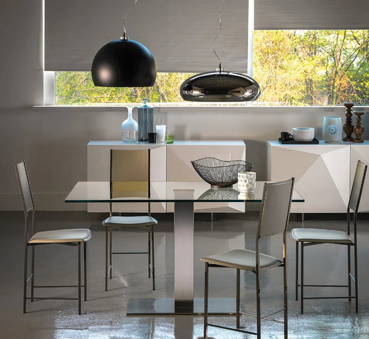 Il tavolo è disponibile con piano in cristallo trasparente da 15 mm o in laminato Fenix nelle raffinate tonalità grigio Londra o castoro Ottawa, abbinato a una base in acciaio inox specchiato o verniciato goffrato in bianco o graphite. Per chi cerca massima versatilità, il top in vetro può essere arricchito con due prolunghe opzionali in acciaio inox, ideali per accogliere più ospiti.