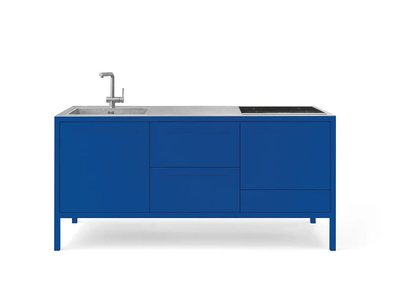 La struttura in tubolare quadrato è disponibile in una vasta gamma di finiture metalliche, mentre il top in acciaio inox AISI 304 Barazza ospita una vasca integrata e un piano cottura a induzione. Completano l’allestimento una lavastoviglie Electrolux da incasso e un rubinetto Barazza in finitura vintage. Una soluzione compatta ma completa, ideale per spazi domestici moderni o ambienti contract.