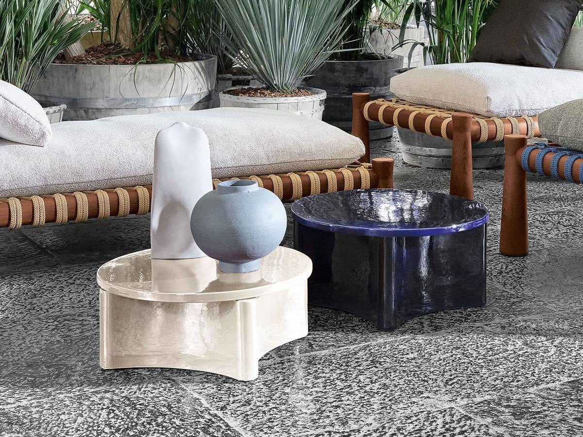 La serie si ispira a suggestioni multietniche, reinterpretate con un gusto moderno e attento alla sostenibilità. I tavolini sono realizzati in Millgres, un materiale ceramico resistente e scenografico, proposto in tre colori brillanti: rosso, bianco e blue.