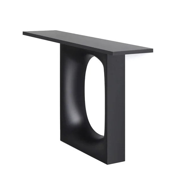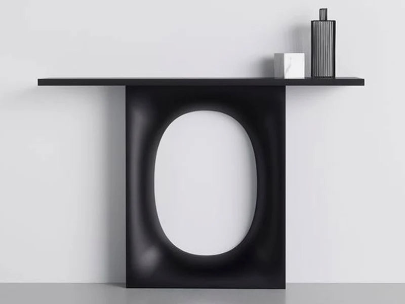 La base in acciaio laccato nero, con un foro ovale distintivo, conferisce alla consolle un carattere forte e essenziale, mentre il top è disponibile in 3 dimensioni e 4 finiture diverse, tutte trattate con un effetto opaco antiriflettente che dona alla superficie un'estetica calda e morbida al tatto.