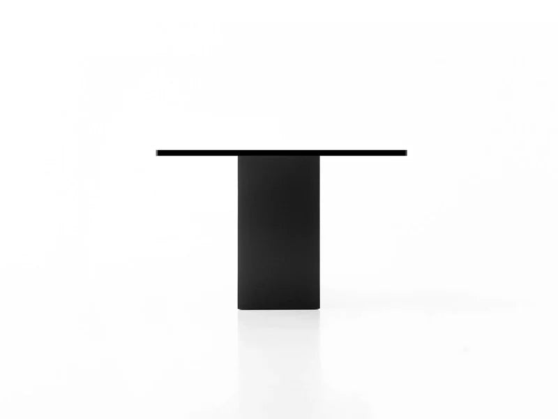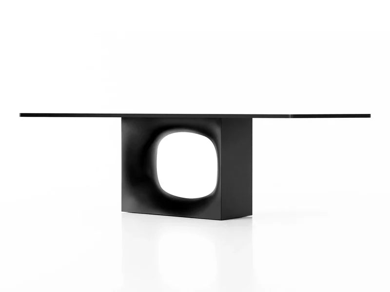 La versatilità di Holo si riflette nelle sue varie configurazioni, inclusi tavoli ovali, rettangolari e console, con opzioni che includono basi singole o doppie. In questa versione, il tavolo rettangolare con basamento centrale presenta un top in legno effetto Rovere tinto nero, con bordo verniciato nero per un look elegante e contemporaneo.