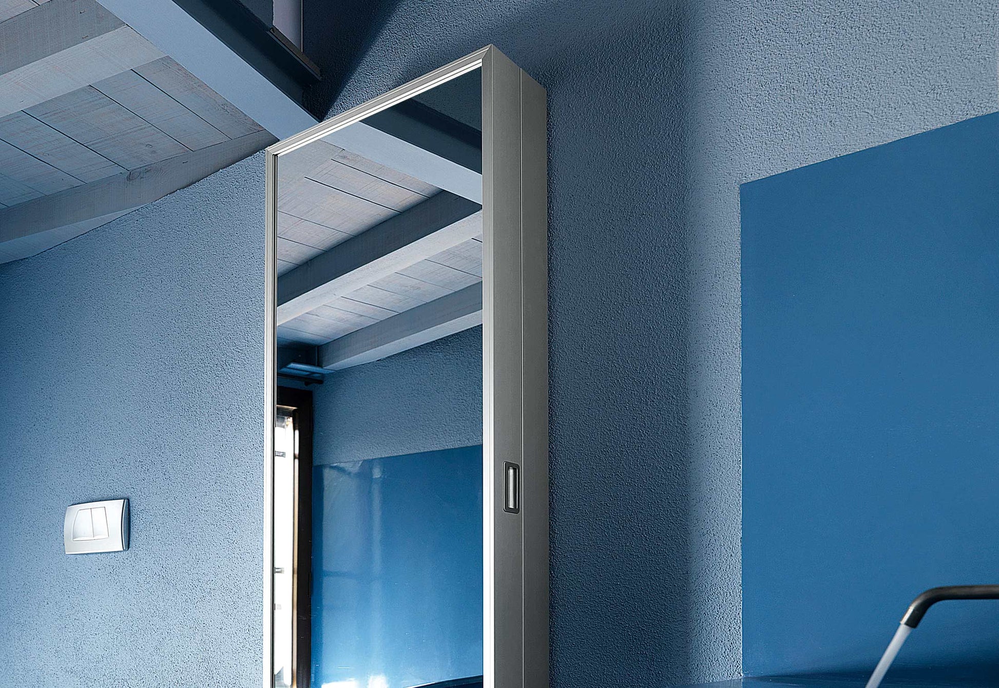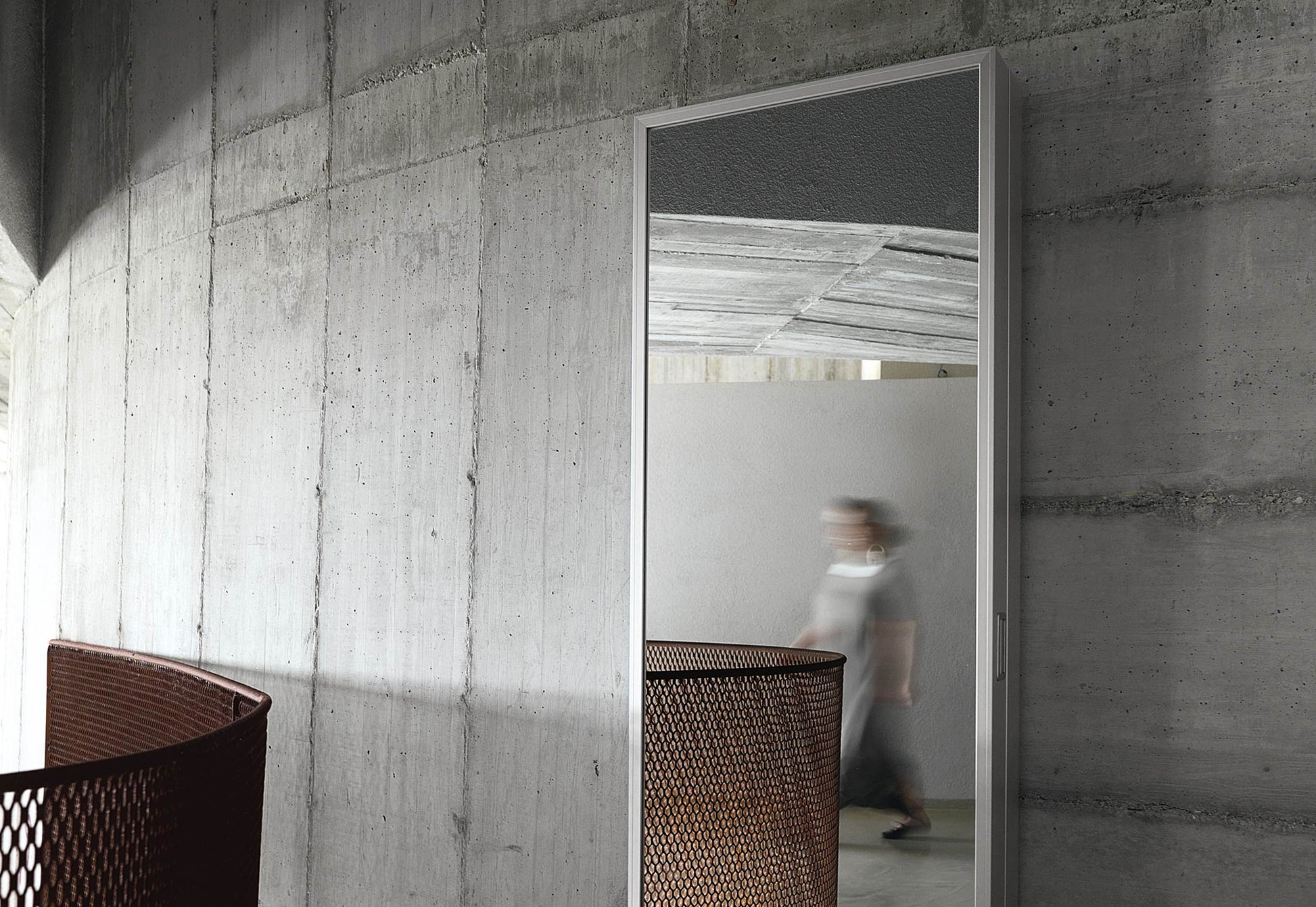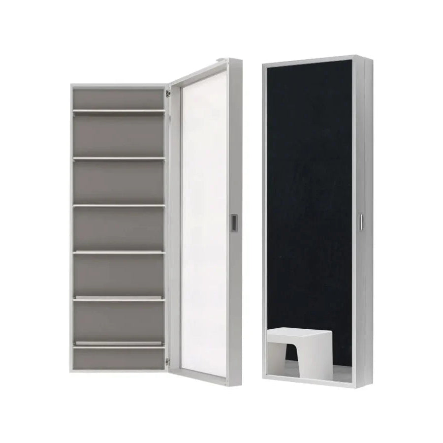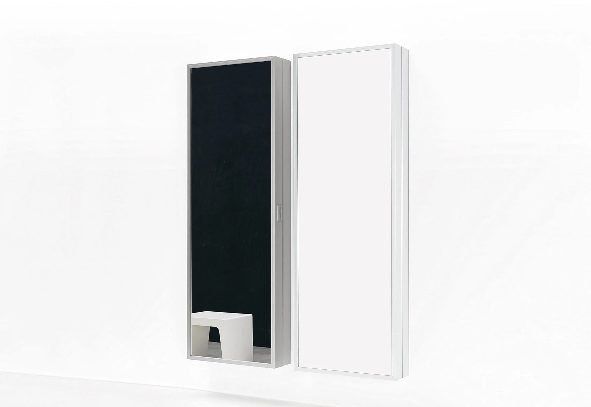 Realizzato in alluminio anodizzato o laccato bianco, si distingue per l’estrema versatilità: può essere montato con apertura dell’anta a destra o a sinistra. L’anta, disponibile in specchio lucido o vetro opaco retroverniciato bianco, si apre completamente a 180° grazie alle cerniere a scomparsa, offrendo accesso completo al contenuto.