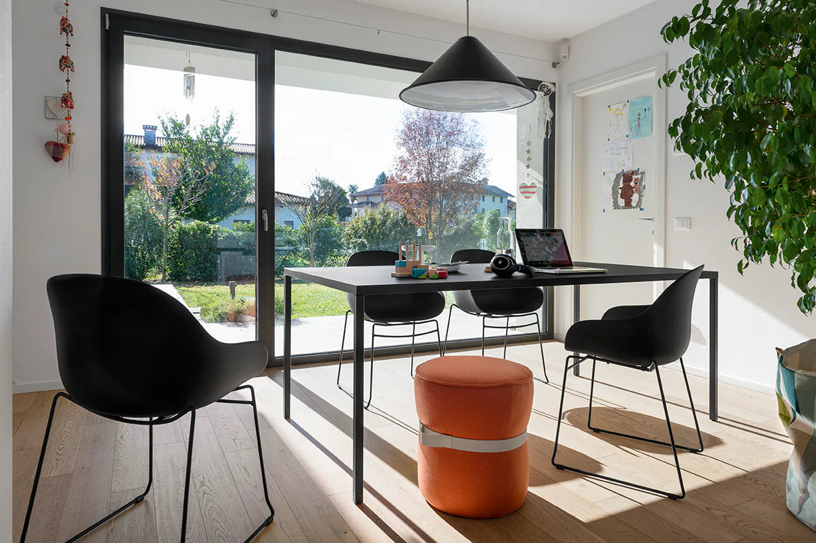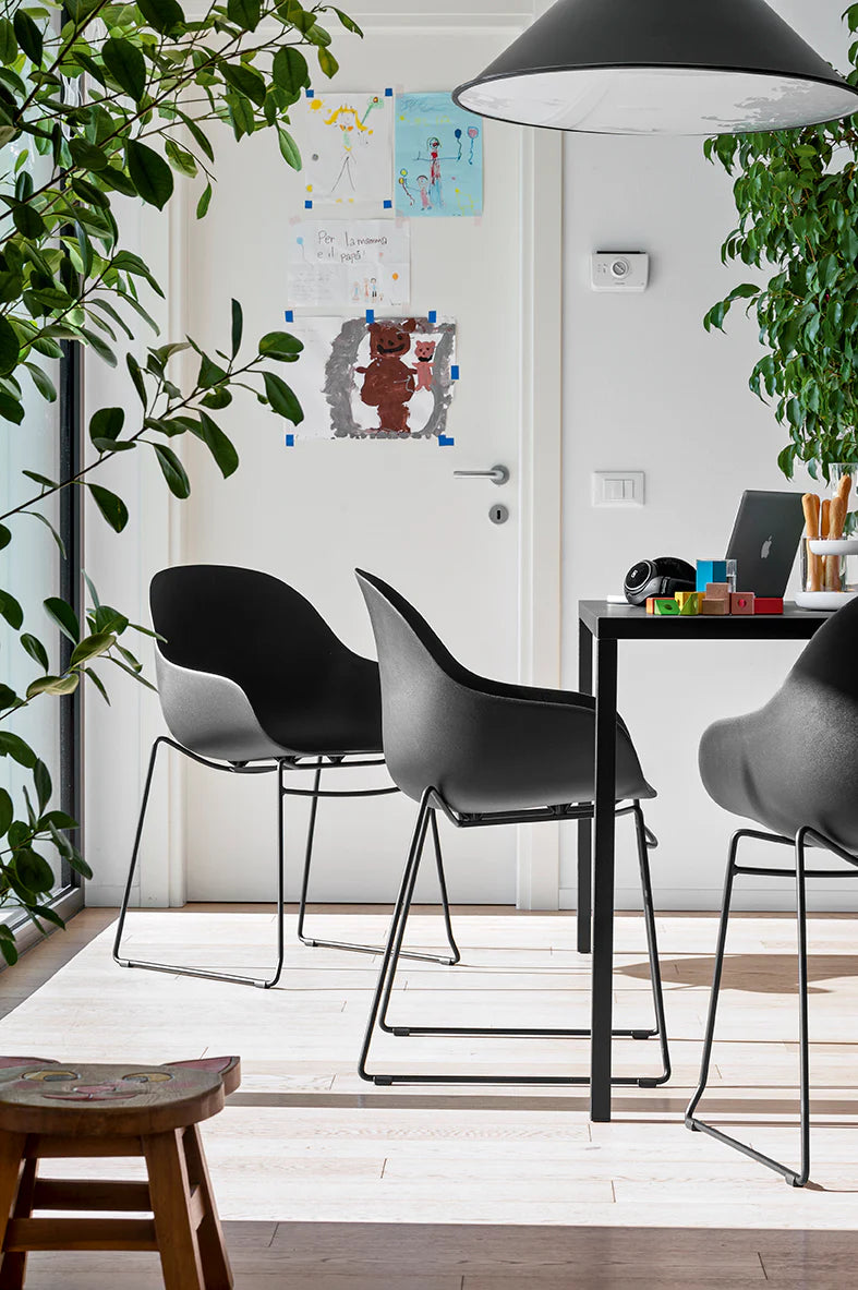 La struttura in tondino metallico a slitta garantisce stabilità, leggerezza e un design elegante che si integra facilmente in ogni ambiente, dalla cucina al living, fino a spazi contract come ristoranti e uffici.