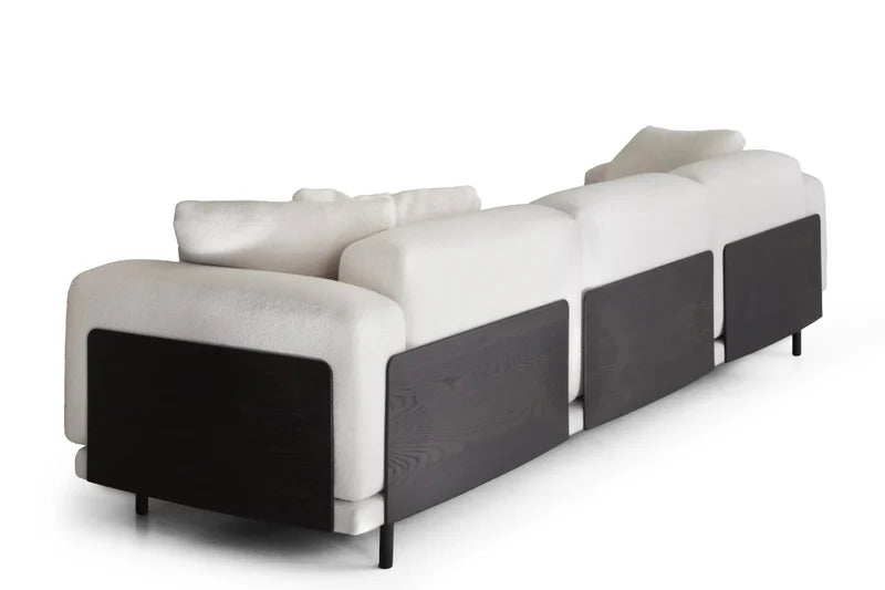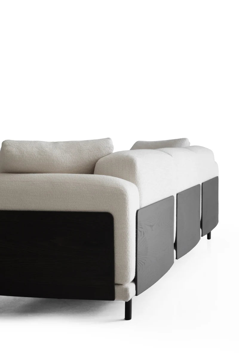 Sollevato su piedini metallici rivestiti in legno, il divano Biscuit si caratterizza per le sue linee rette e il design essenziale, arricchito da pannelli in frassino tinto bruno sui lati e sullo schienale. Questo contrasto sofisticato si sposa perfettamente con le cuscinature rigide, rivestite in tessuto, che garantiscono comfort e supporto senza compromettere lo stile. I braccioli ampi aggiungono un tocco di morbidezza al design geometrico, creando una fusione armoniosa tra rigore e accoglienza.