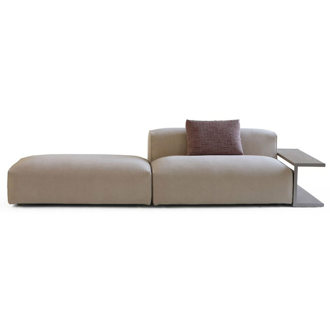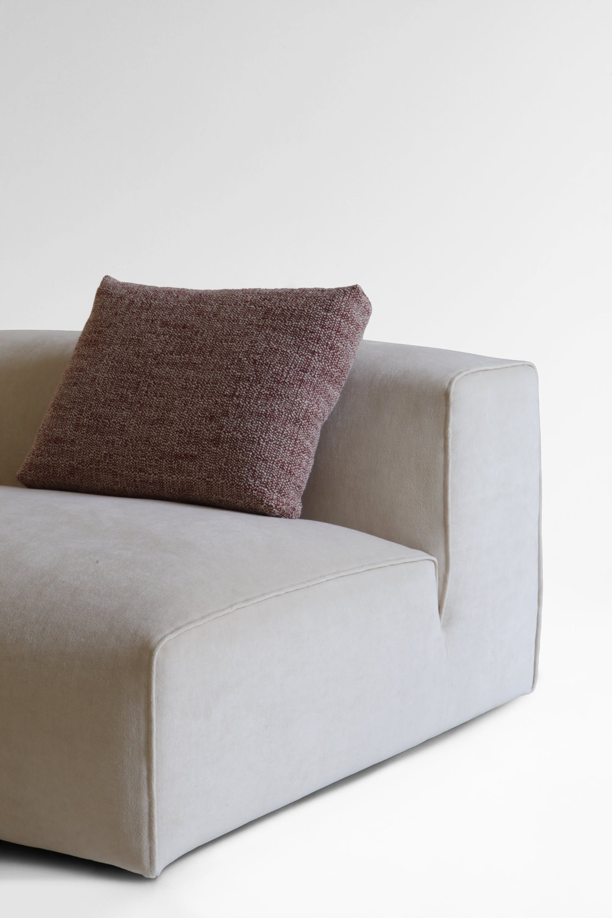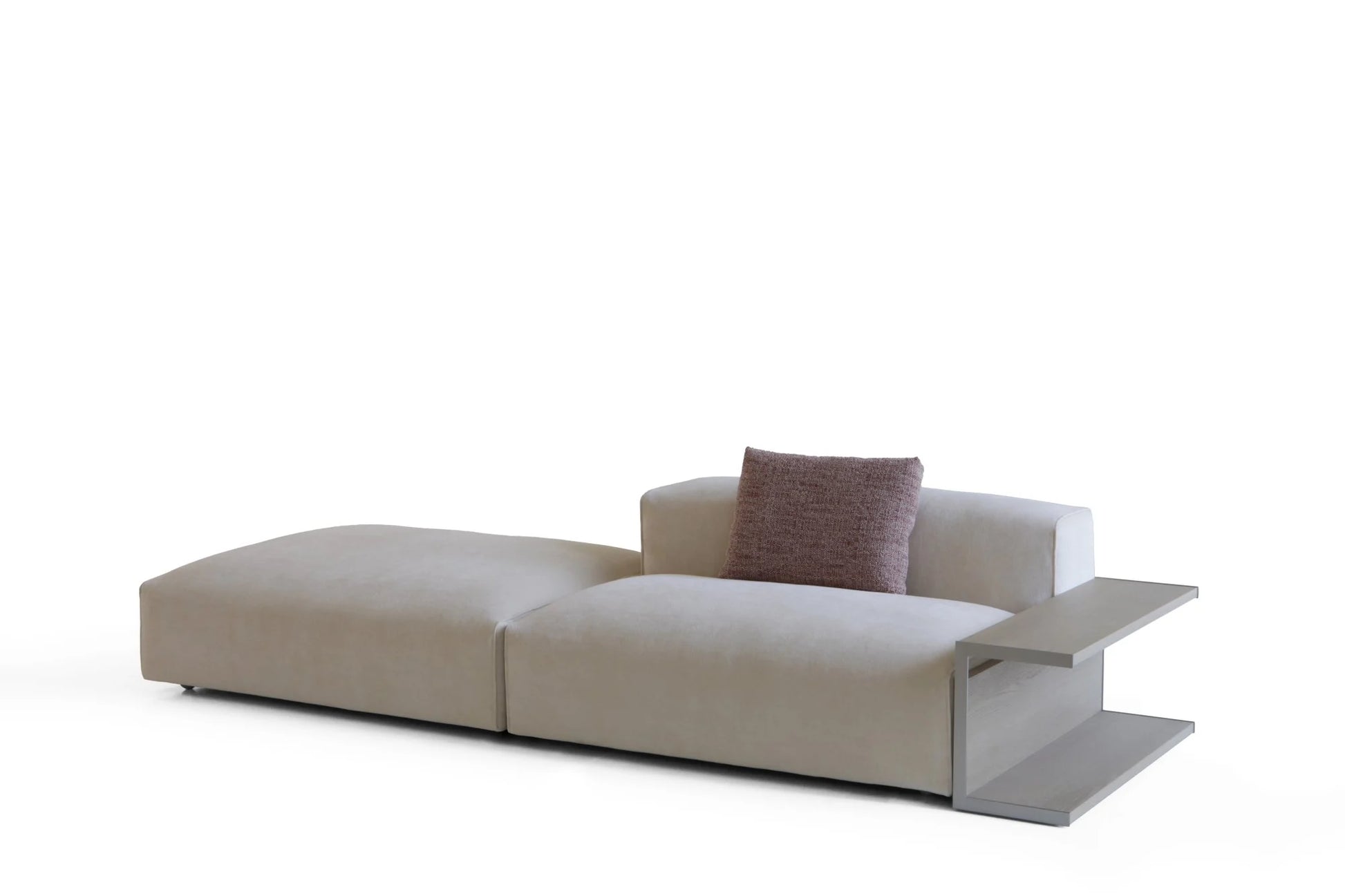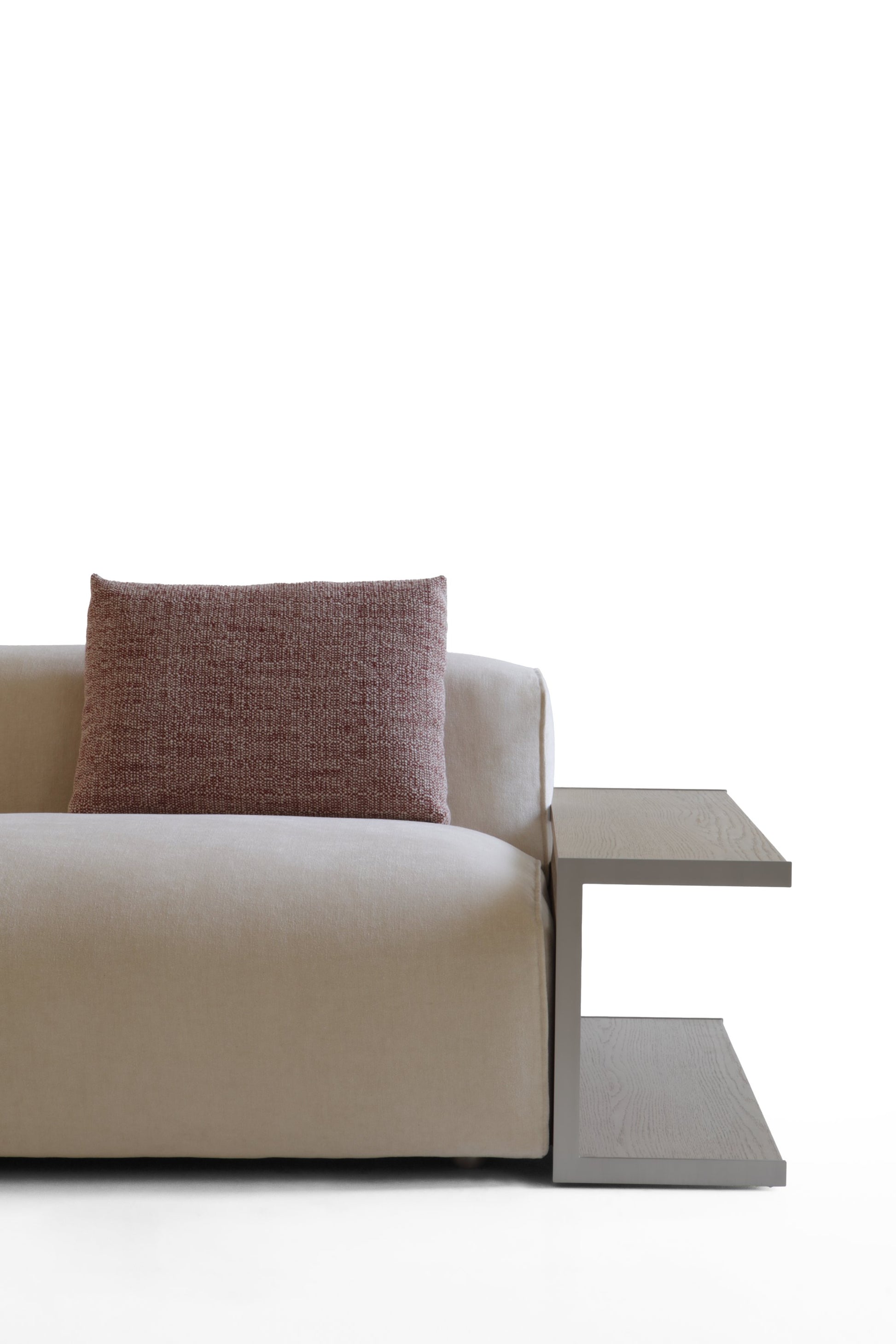 La combinazione di volumi morbidi e consolle metalliche a C (disponibili in metallo nichel satinato o legno della collezione Porro) permette di creare infinite configurazioni, dando vita a un ambiente dinamico e giocoso. L'interazione tra i materiali pregiati e le forme fluide accentua l'eleganza senza tempo del divano, che risulta perfetto in ambienti moderni o classici, adattandosi a ogni tipo di stile.