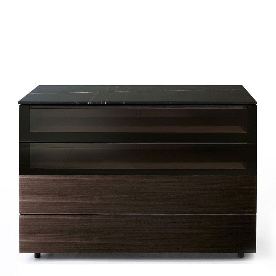 La versione presentata combina una struttura in noce termotrattato W17 con un sontuoso top in marmo Sahara Noir R54, offrendo una presenza visiva imponente ma sobria. I cassetti con frontale in vetro trasparente e profilo nero aggiungono leggerezza e modernità, mentre le vaschette interne in melamminico eucalipto E10 assicurano un’organizzazione impeccabile.
