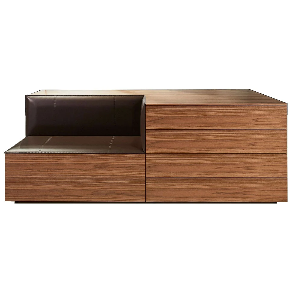 Composta da una panca centrale in cuoio e dodici cassetti (quattro in cristallo trasparente e otto con finitura coordinata alla struttura), l’isola offre un’alternanza dinamica tra pieni e trasparenze, tra rigore e calore materico. I cassetti interni in laccato opaco aggiungono un dettaglio cromatico e raffinato che riflette l’estetica funzionale del brand.