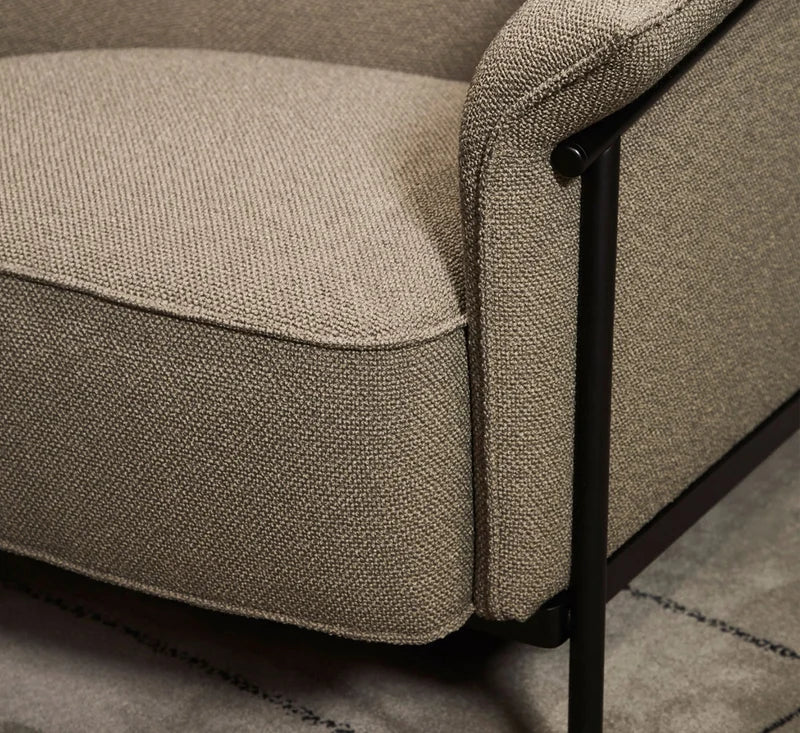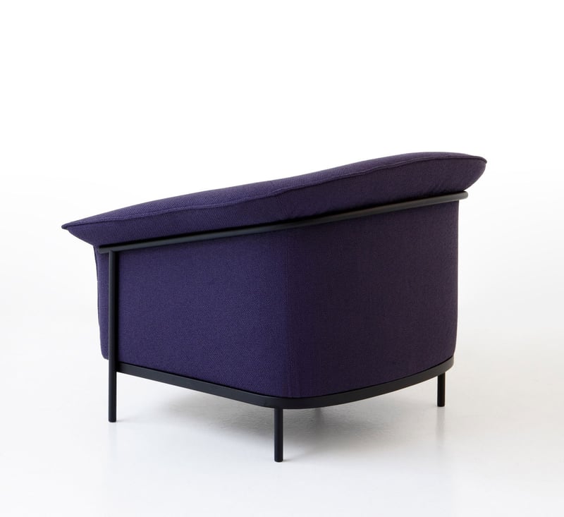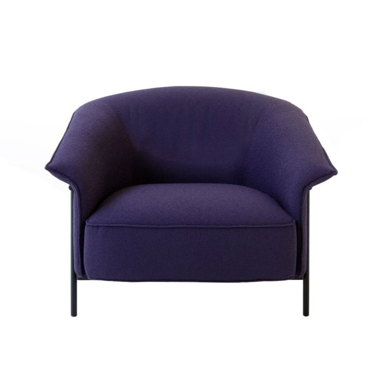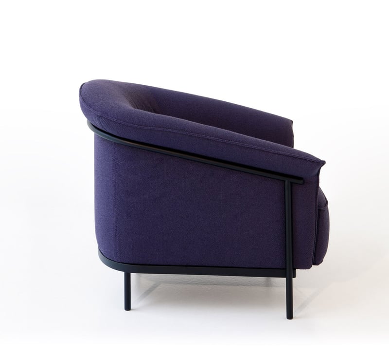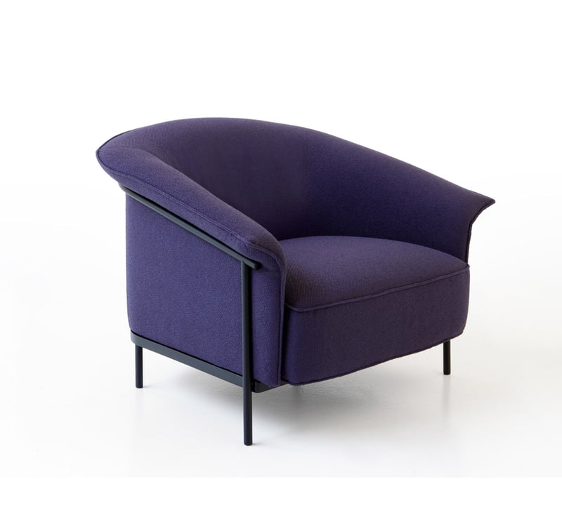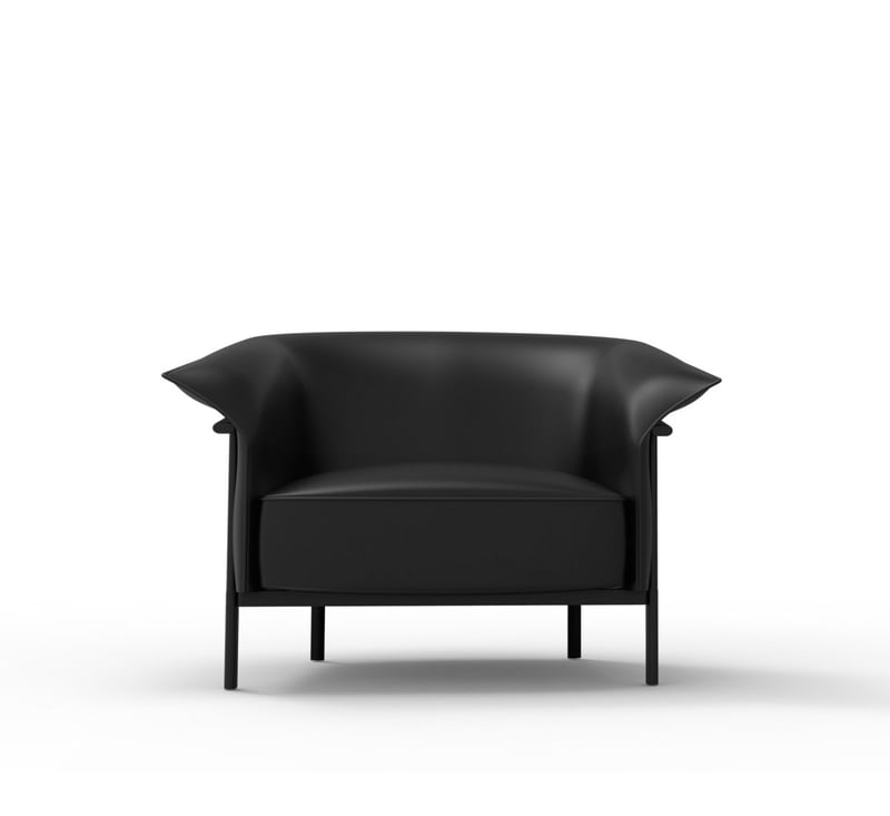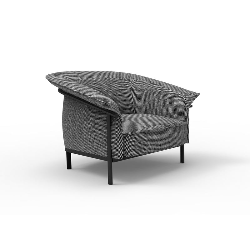La struttura in tondino metallico nero opaco disegna un profilo fluido e grafico, mentre la seduta, lo schienale e i braccioli sono generosamente imbottiti e rivestiti in tessuto, pelle o ecopelle. Il design, ispirato all’eleganza sartoriale, richiama un cappotto con bavero ripiegato, offrendo un raffinato sostegno per le braccia.