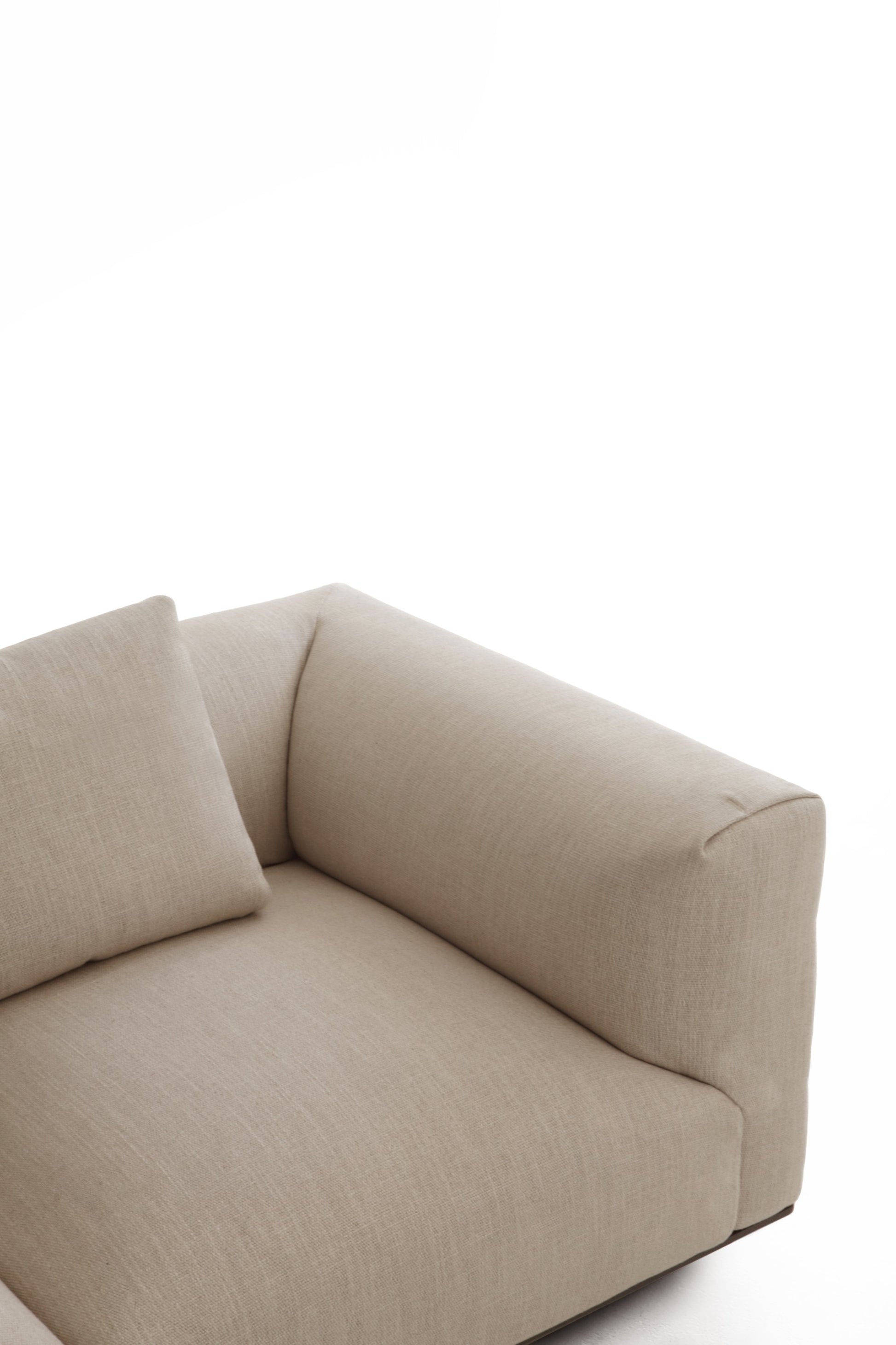Le grandi cuscinature quadrate costituiscono una seduta avvolgente, mentre i braccioli e schienali soffici accentuano il comfort e l’attenzione ai dettagli. Il tessuto modellato a pieghe, lavorato con maestria artigianale, rende ogni elemento un vero e proprio esempio di alta moda, mentre i cuscini volanti invitano al relax. Questo divano è disponibile in diverse configurazioni cromatiche, adattandosi perfettamente a living eleganti e contemporanei.