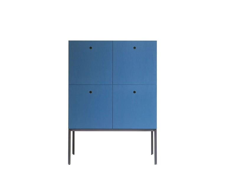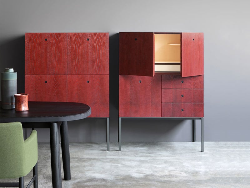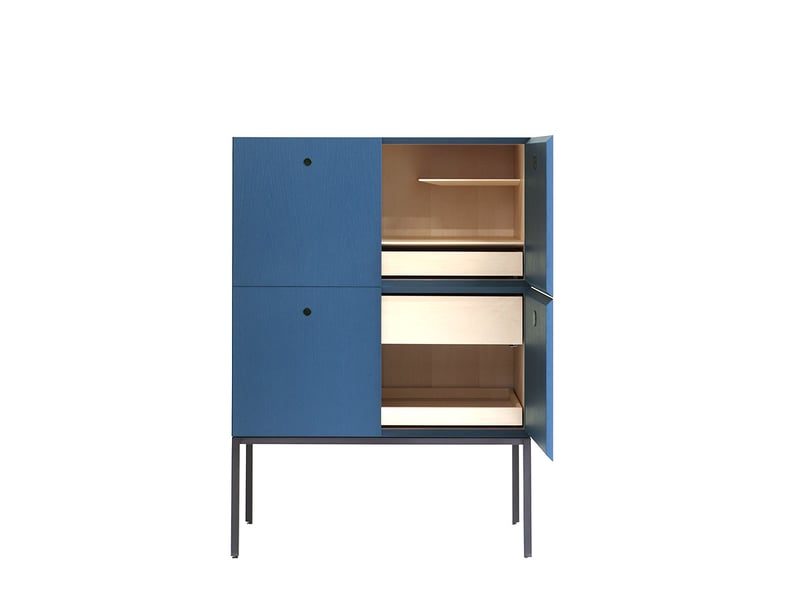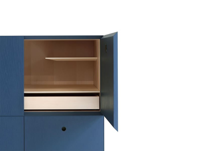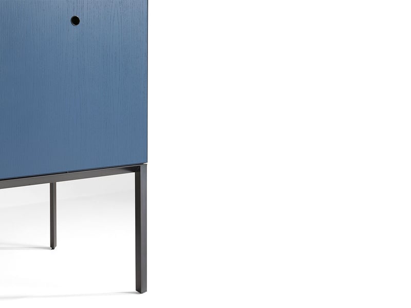 Realizzate in frassino lavorato a 45°, le strutture permettono la continuità visiva delle venature del legno su tutti i lati, esaltando la naturale bellezza del materiale. Gli interni in acero naturale contrastano elegantemente con l’esterno in frassino verniciato a poro aperto, disponibile nei sofisticati colori Offshore e Carminio. Il basamento in finitura Iron e le maniglie a incavo placcate in metallo completano l’equilibrio tra funzionalità e design.