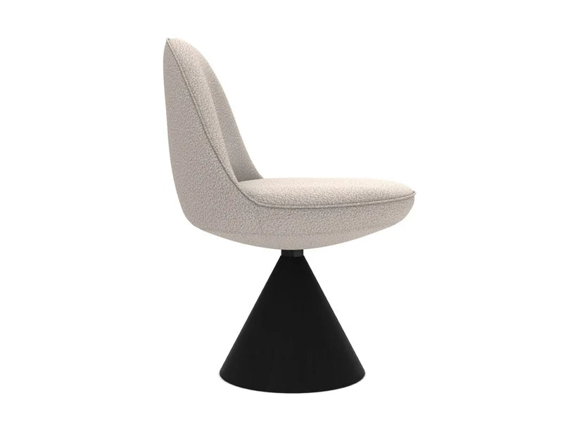 Ispirata al design anni '70, Romby si distingue per la sua forma scultorea, dove la base conica in legno scolpito dialoga con la seduta morbida e arrotondata, creando un equilibrio tra rigore formale e accoglienza. La seduta girevole assicura libertà di movimento e un’eccellente ergonomia, rendendola perfetta per sale da pranzo, ambienti di lavoro, sale riunioni e spazi contract.