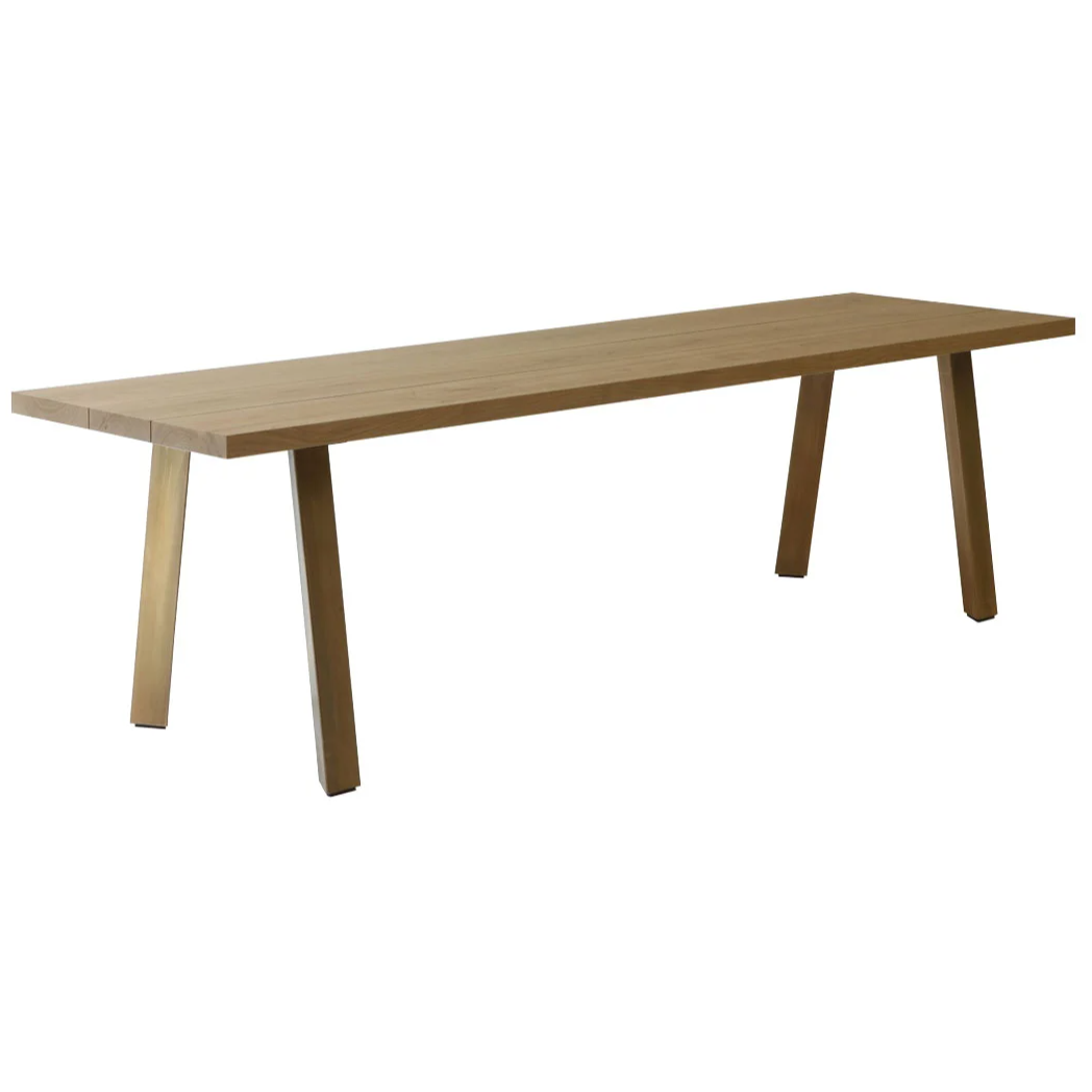 Le gambe triangolari, robuste e ben proporzionate, creano un raffinato cavalletto su cui poggia il piano, che conserva volutamente differenze minime tra le tavole, piccole fenditure a vista e nappe annodate: segni autentici della materia, valorizzati con sensibilità contemporanea.