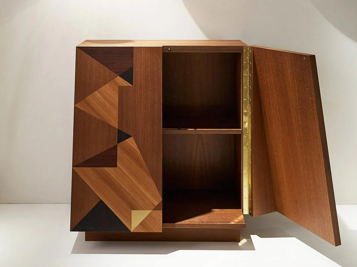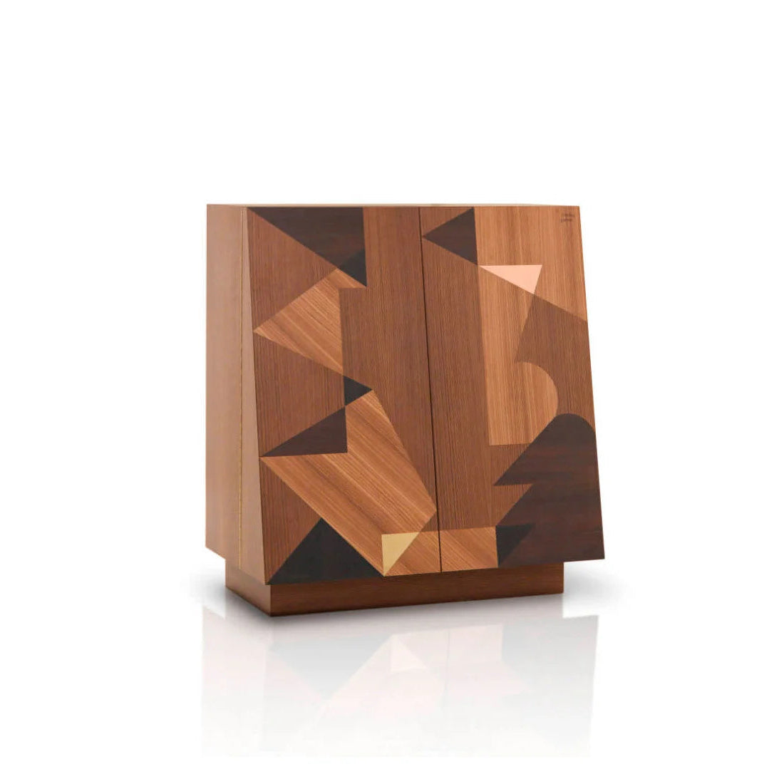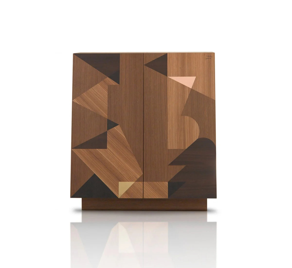 Dotata di due ante a spiovente con intarsio grafico, la sua superficie è un mosaico dinamico ottenuto attraverso l’utilizzo di tre essenze di legno diverse: acacia, olmo e rovere. Questo gioco geometrico di linee rette e curve crea un pattern visivo vivace e imprevedibile, rendendo ogni pezzo unico.