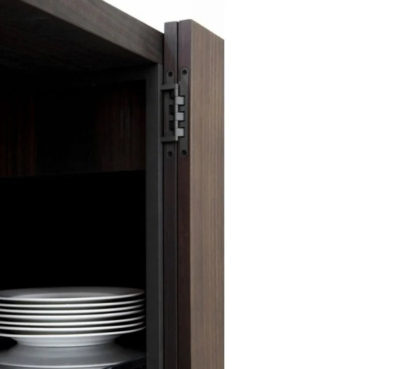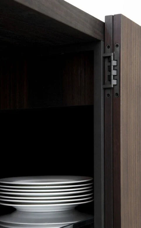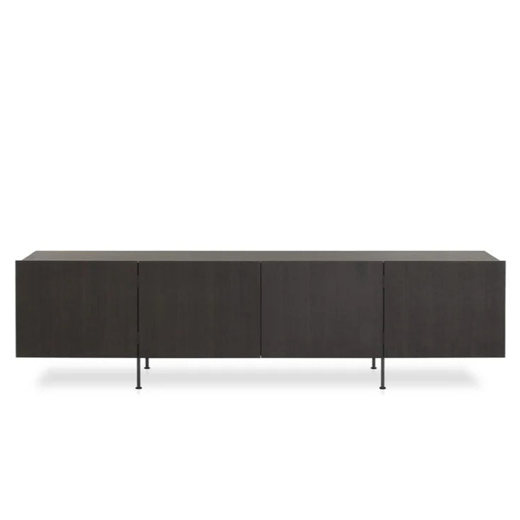 La struttura è realizzata in pregiato legno di eucalipto, mentre i ripiani interni in cristallo offrono leggerezza visiva e funzionalità. La madia poggia su 4 piedini in metallo nero opaco, che la sollevano da terra donandole slancio e raffinatezza.