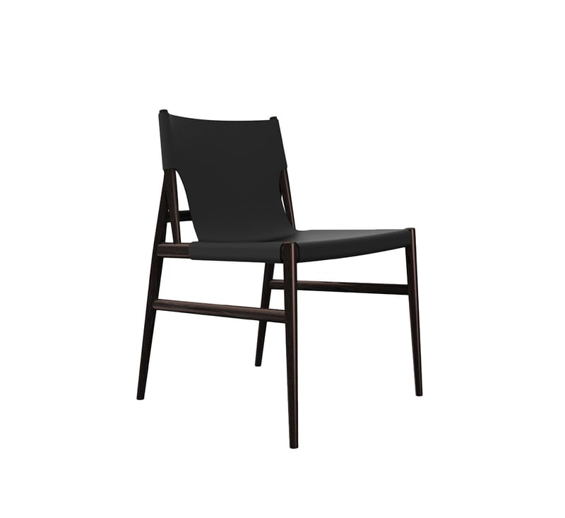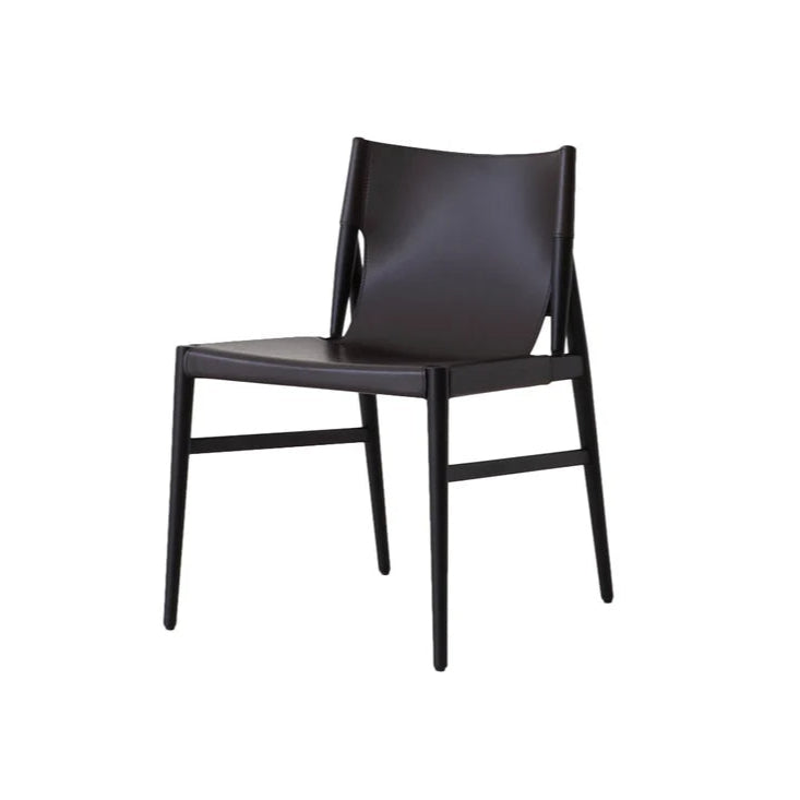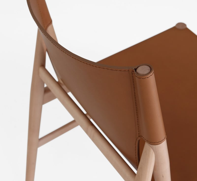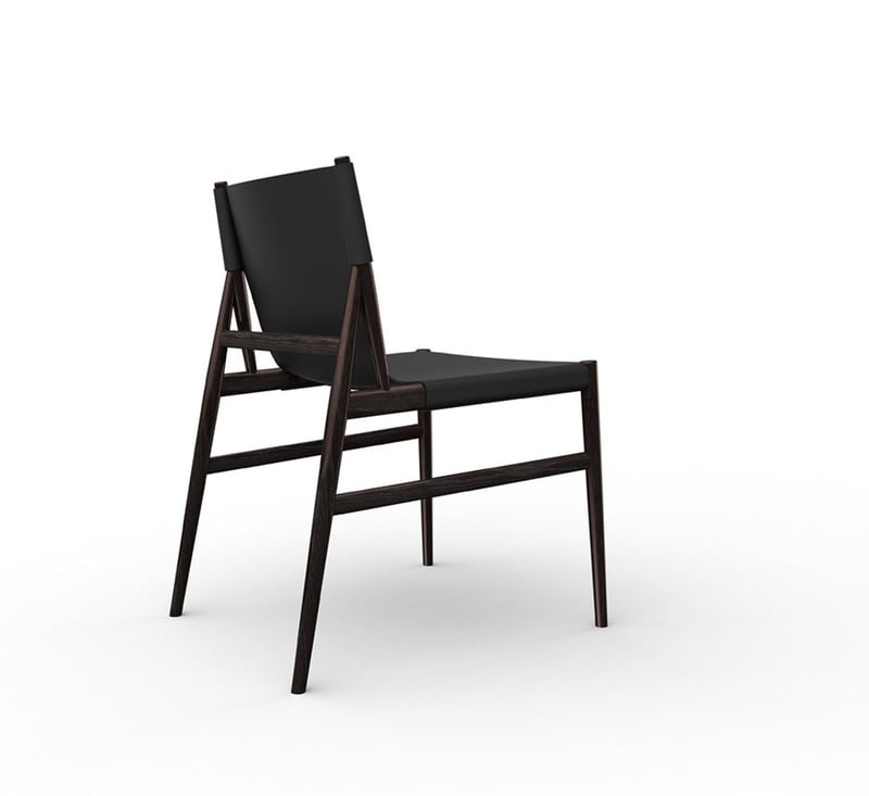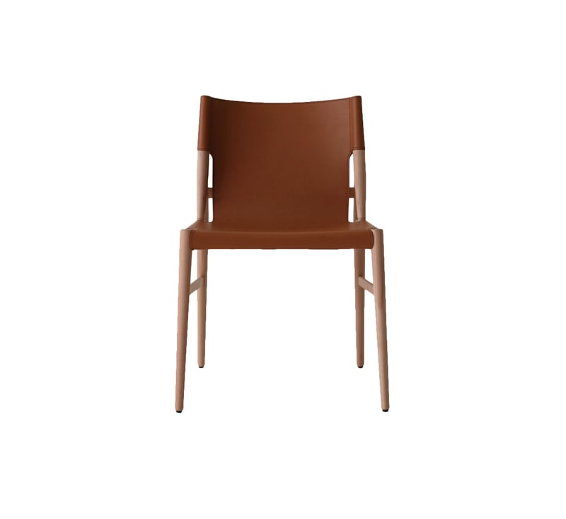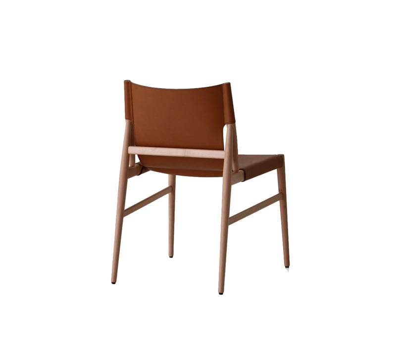 Le inclinazioni calibrate della struttura in legno conferiscono dinamicità e slancio visivo, rendendo ogni punto di vista unico e architettonico. Il contrasto tra il calore del legno e la matericità del cuoio crea una sedia dallo stile indiscutibile, adatta a contesti residenziali e contract che esigono eleganza, funzionalità e personalità.