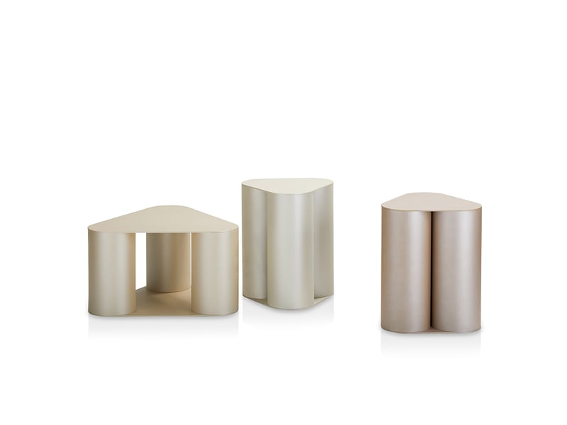 Il Tres Tavolino di Saba, progettato dal duo creativo valenciano Mut Design, è un complemento d’arredo dal design geometrico e dinamico, capace di unire leggerezza visiva e solidità strutturale. Presentato al Salone del Mobile 2024, Tres prende forma da due piani triangolari con angoli arrotondati, collegati da tre cilindri metallici che ne definiscono l’unicità. Il suo nome celebra l’equilibrio tra geometria e poesia: “Tres” come i tre punti d’incontro, le tre gambe e le finiture madreperla cangianti, ispirate alla raffinata iridescenza della conchiglia. Un pezzo scultoreo e decorativo, perfetto per interni moderni ed eclettici.