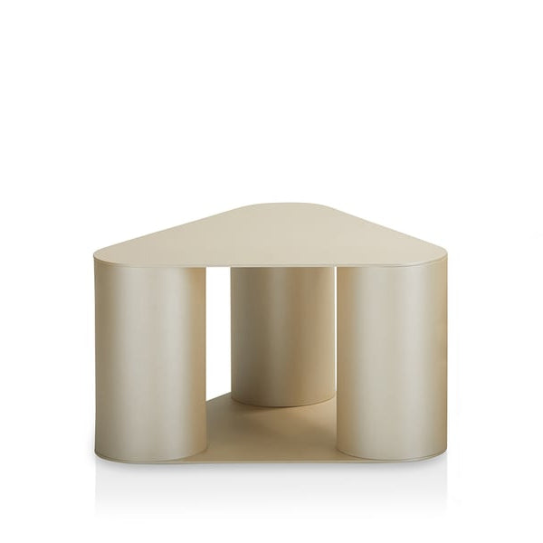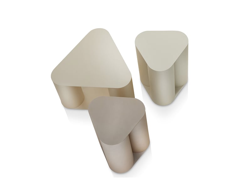 Tres Tavolino Basso è un oggetto d’arredo scultoreo e sorprendente firmato dal duo spagnolo Mut Design per Saba, presentato in anteprima al Salone del Mobile 2024. Il tavolino nasce da un’idea essenziale ma d’impatto: due piani triangolari con angoli arrotondati, collegati da tre cilindri metallici, danno forma a un oggetto geometrico, dinamico ed equilibrato. Il nome "Tres" evoca un incontro armonioso tra tre elementi — top, base e struttura — e trae ispirazione dal concetto di socialità e condivisione. Le finiture madreperlate, con i loro riflessi cangianti, aggiungono un alto valore decorativo, rendendo Tres il tavolino perfetto per ambienti sofisticati, moderni e ricercati.