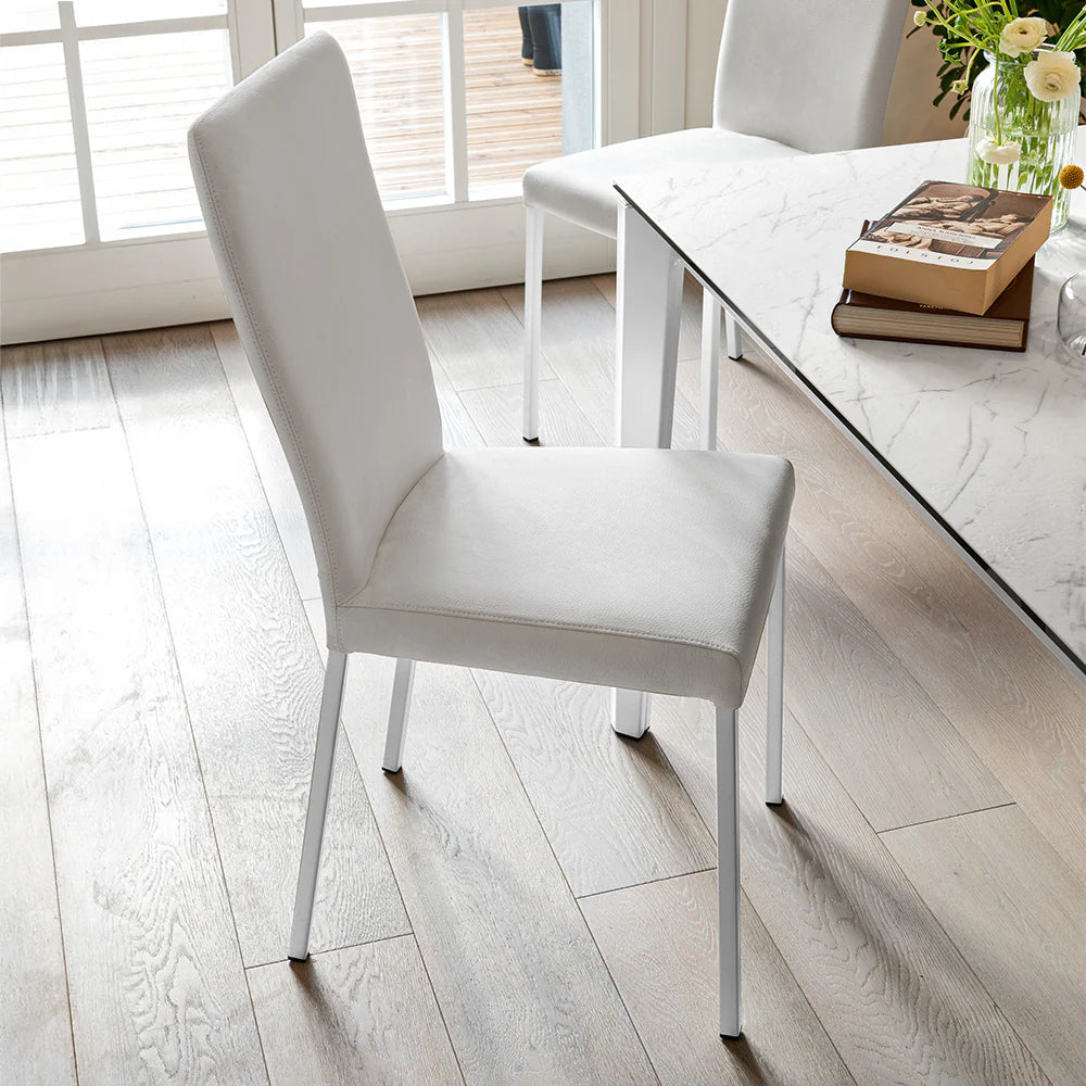 Le 4 gambe in metallo sono verniciate in tinta con il rivestimento della seduta, creando un insieme armonioso e raffinato. La cura progettuale delle linee rende la sedia morbida, ergonomica e piacevole, ideale per soggiorni, sale da pranzo, bar, ristoranti e comunità. GARDA combina resistenza, eleganza e praticità, offrendo una seduta versatile e durevole nel tempo.