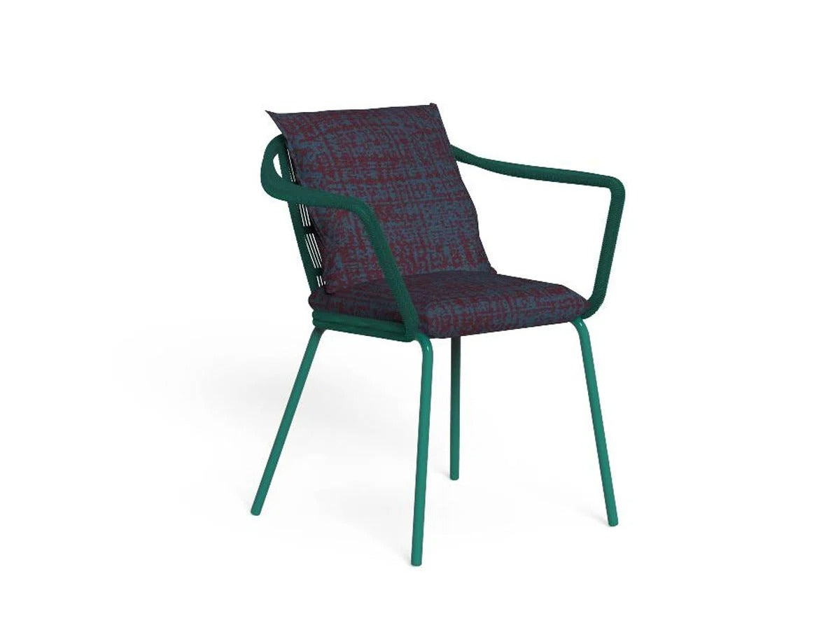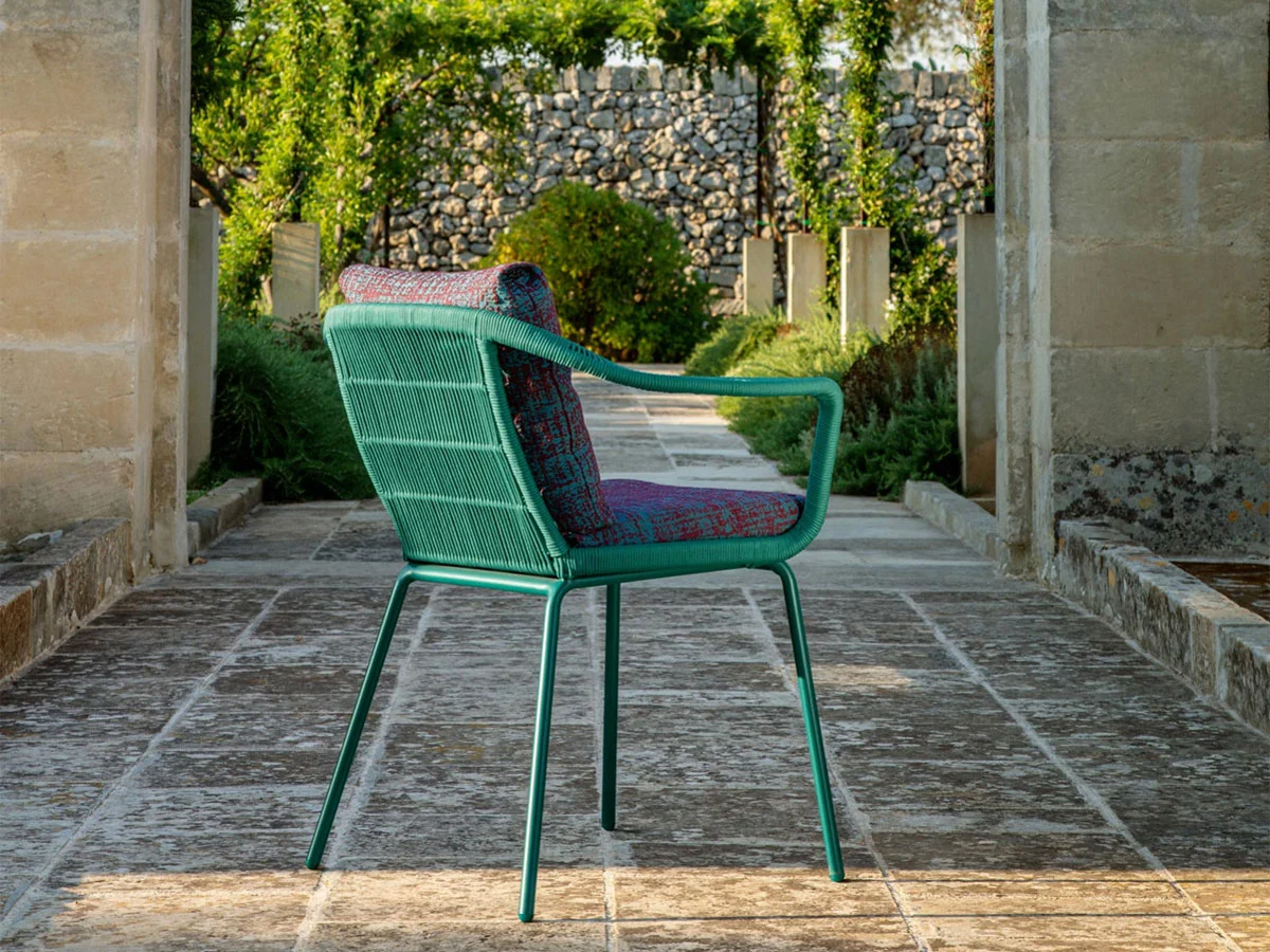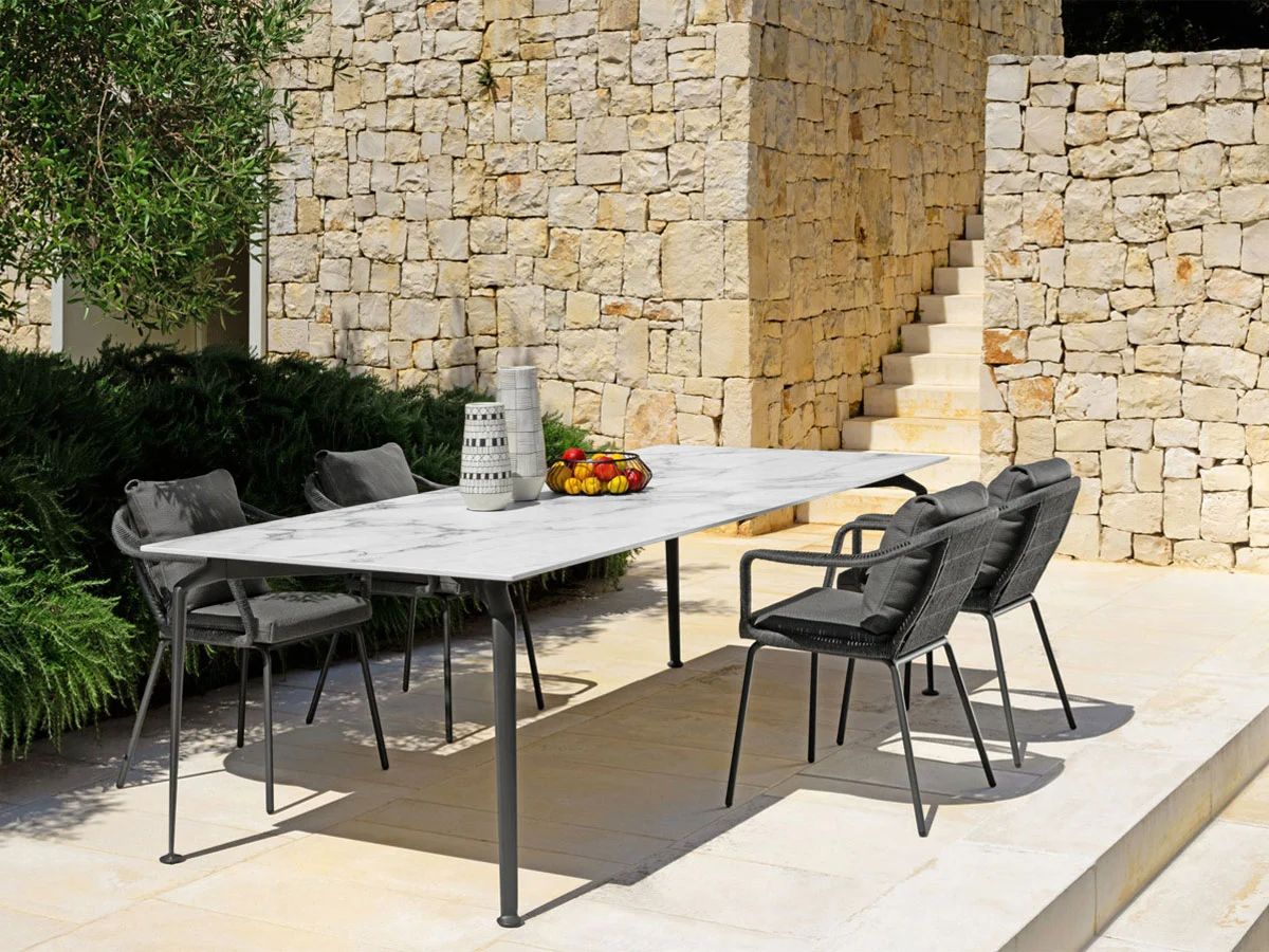 Lo schienale e i braccioli sono avvolti da corde sintetiche intrecciate, mentre il rivestimento in tessuto sfoderabile è progettato per resistere agli agenti atmosferici, rendendo Cruise Alu la scelta perfetta per pranzi all’aperto in giardino, terrazza o a bordo piscina.
