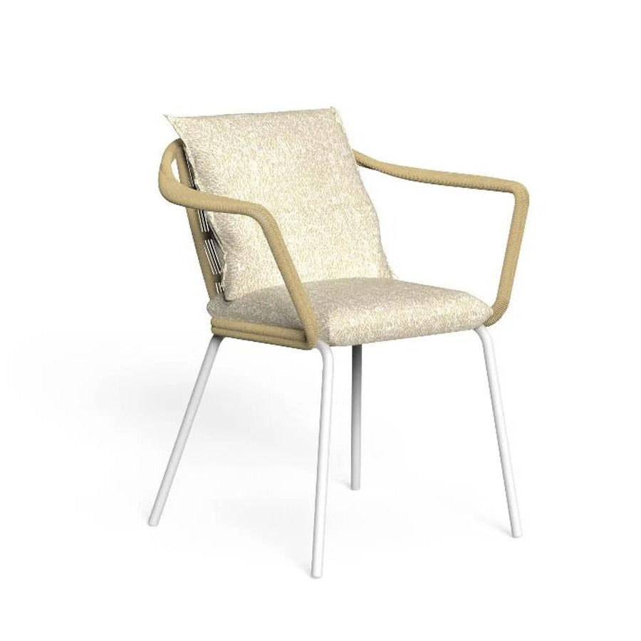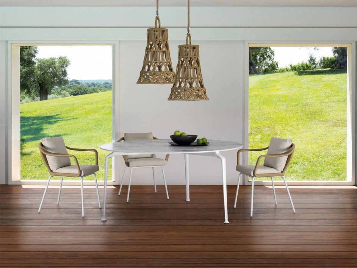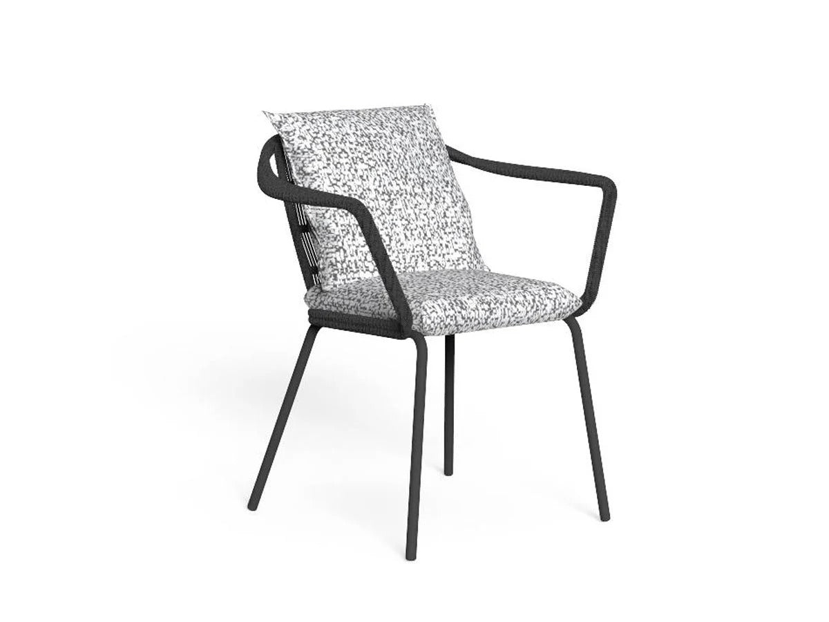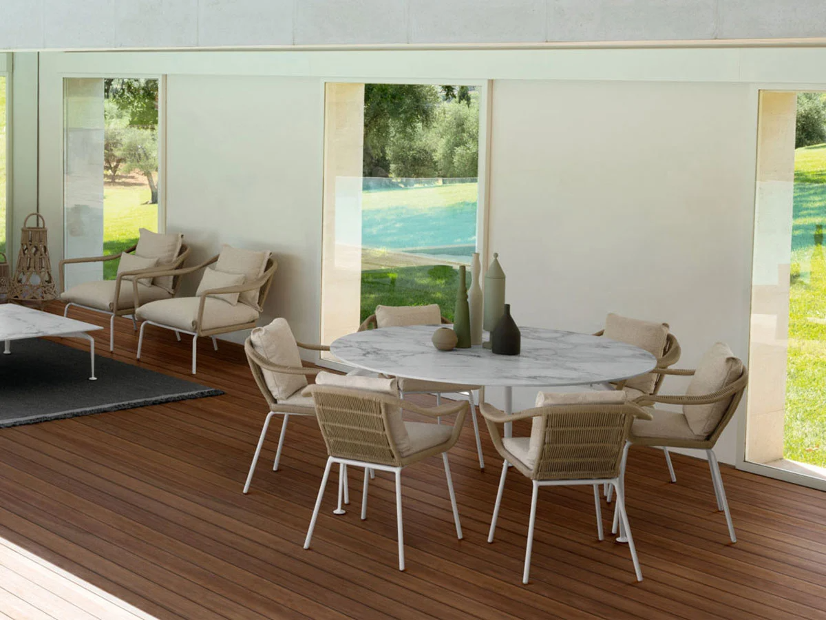 Lo schienale e i braccioli sono avvolti da corde sintetiche intrecciate, mentre il rivestimento in tessuto sfoderabile è progettato per resistere agli agenti atmosferici, rendendo Cruise Alu la scelta perfetta per pranzi all’aperto in giardino, terrazza o a bordo piscina.