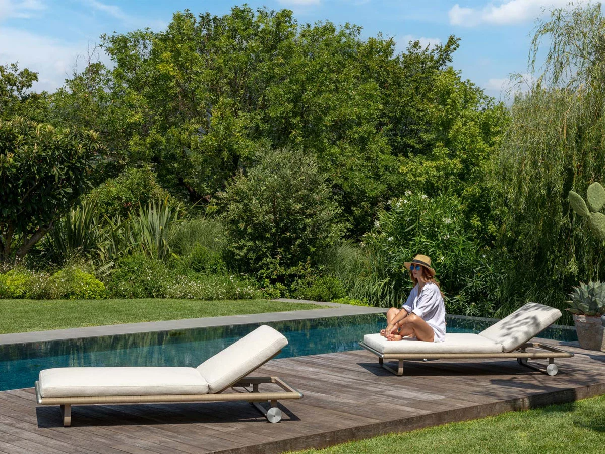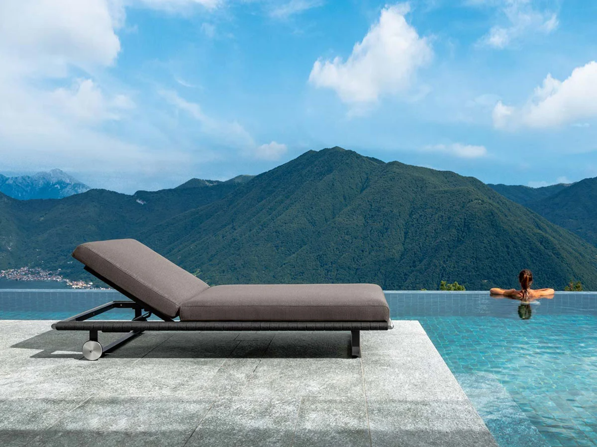 Il lettino presenta montanti in acciaio inox e uno schienale reclinabile, mentre le fasce intrecciate imbottite regalano un effetto visivo distintivo e un’ergonomia perfetta. La cuscineria sfoderabile è realizzata in quick dry foam, un materiale ad asciugatura rapida rivestito in tessuto outdoor tecnico, progettato per resistere ad agenti atmosferici e mantenere nel tempo comfort e bellezza.