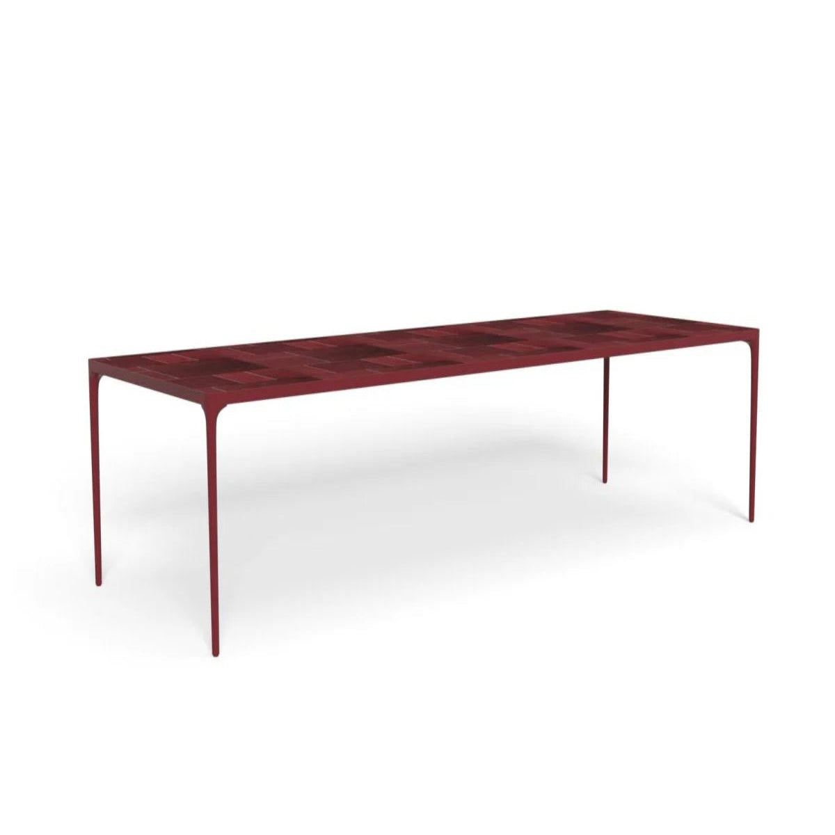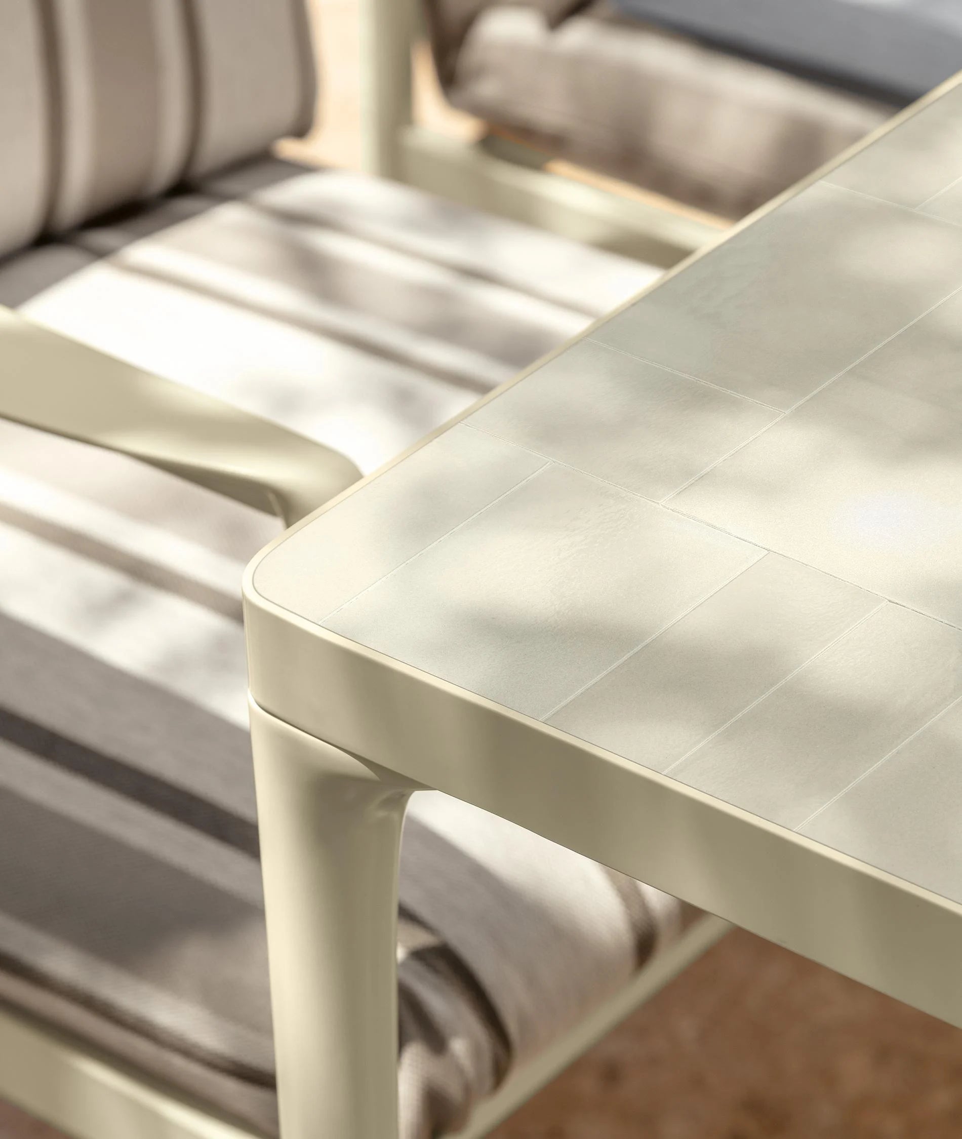La struttura in alluminio verniciato a polvere, disponibile nei raffinati colori bianco, grafite, rosso e blu, unisce robustezza e leggerezza visiva. Il piano in gres smaltato, realizzato artigianalmente con un mosaico esclusivo, presenta sfumature e texture uniche, trasformando ogni tavolo in un pezzo irripetibile. Ideale per chi desidera un tavolo importante che combini estetica, qualità e durabilità in ogni dettaglio.