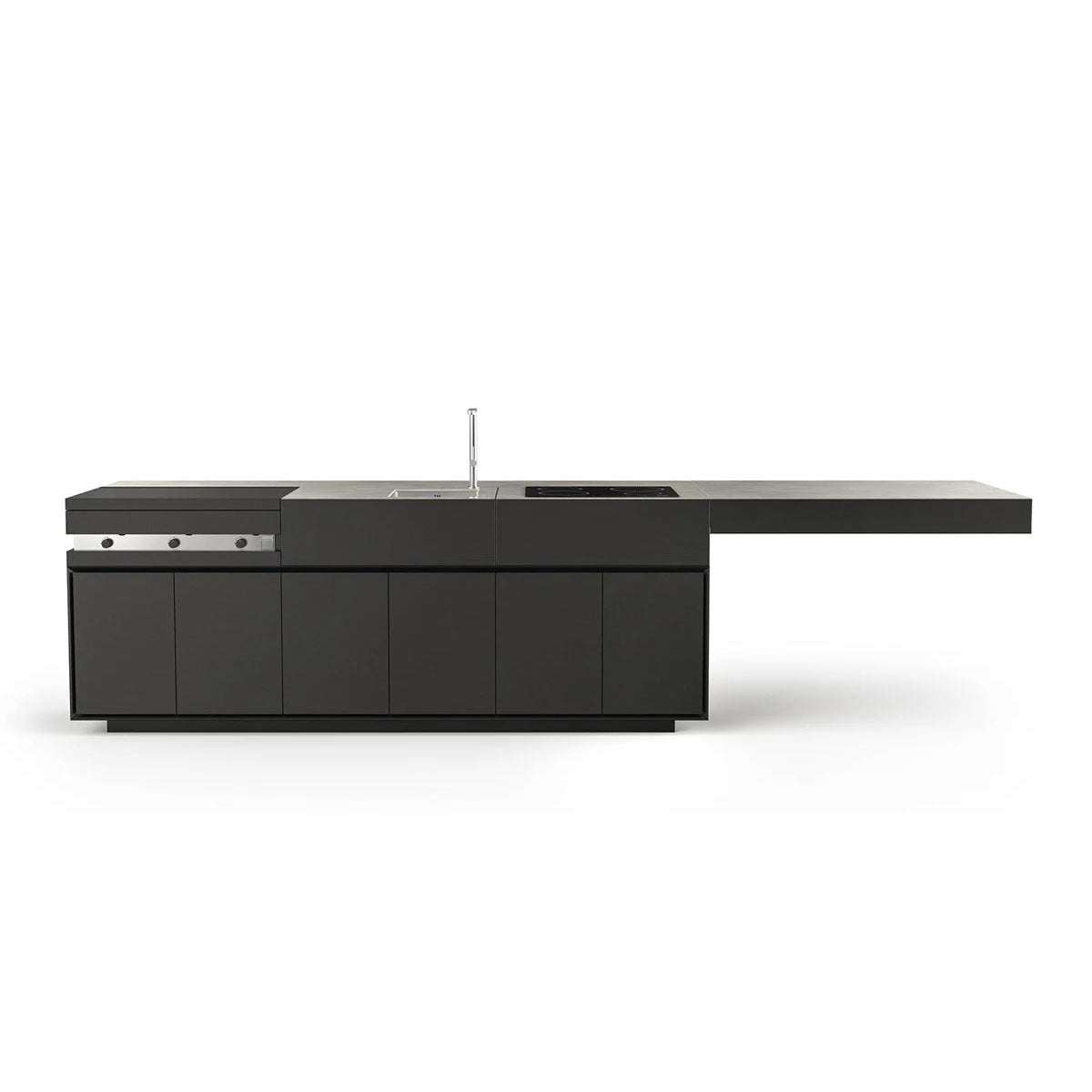Ogni modulo è pensato per offrire massima funzionalità: barbecue con sistema Fire Core, lavello Foster in acciaio AISI 304, piano a induzione con zone Bridge e Booster. Le ante con maniglie a incasso offrono apertura rapida a 125° e chiusura BluMotion, per un’esperienza d’uso fluida e silenziosa.