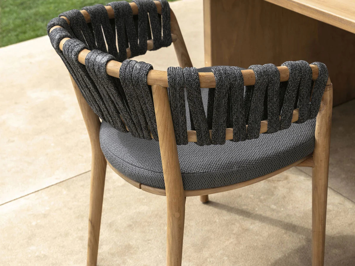 La struttura in teak naturale, resistente e pregiata, dona calore e una presenza elegante alla seduta. Questo legno, rinomato per la sua resistenza agli agenti atmosferici, garantisce durata e bellezza nel tempo. La cuscineria, rivestita in tessuto tecnico outdoor, è progettata per affrontare sole, pioggia e umidità, mantenendo al contempo un comfort elevato e un’estetica curata.