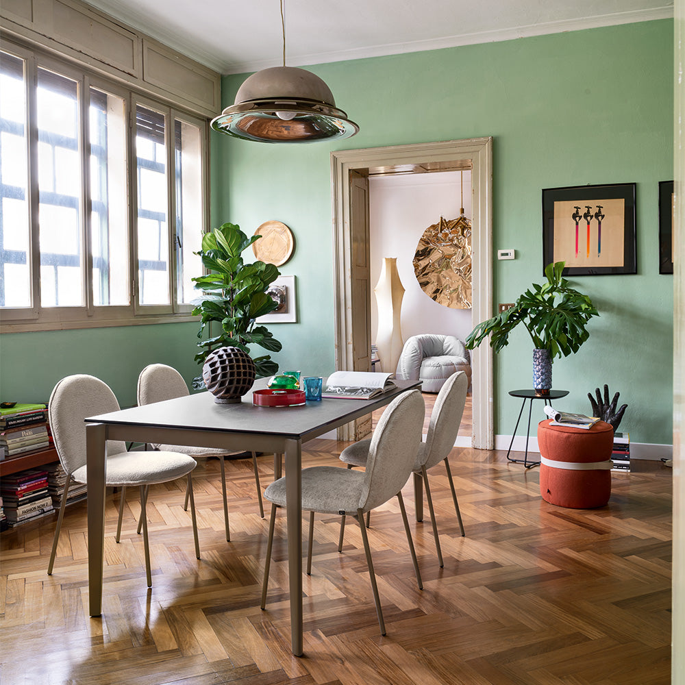 I fianchi arrotondati in metallo verniciato donano un tocco moderno e raffinato, mentre la varietà di finiture disponibili per il piano permette di personalizzare il tavolo in base al proprio stile d’arredo.